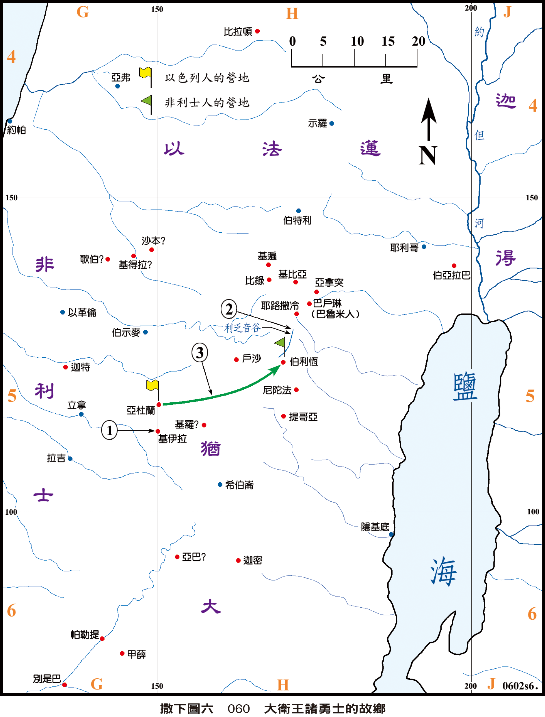 * #撒下20:1-22| 押沙龍謀反被彌平後,接著又有示巴叛變,於是以色列人都跟隨示巴。大衛令原押沙龍叛軍的元帥亞瑪撒三日內招聚猶大人,但亞瑪撒卻耽延過了期限,於是大衛委託亞比篩和約押先去平亂。他們到了基遍的大磐石那裡,見標線1,亞瑪撒來迎接他們,約押乘機刺殺了亞瑪撒。約押的隨從招降亞瑪撒的軍隊,跟隨約押去追趕示巴。示巴走遍以色列各支派,直到伯瑪迦的亞比拉,見動線2,約押就圍困那城。城裡一個聰明婦人問約押攻城的原由,當知道係因示巴叛變,就去勸眾人割下示巴的首級,丟給約押,方解城被吞滅的危機。