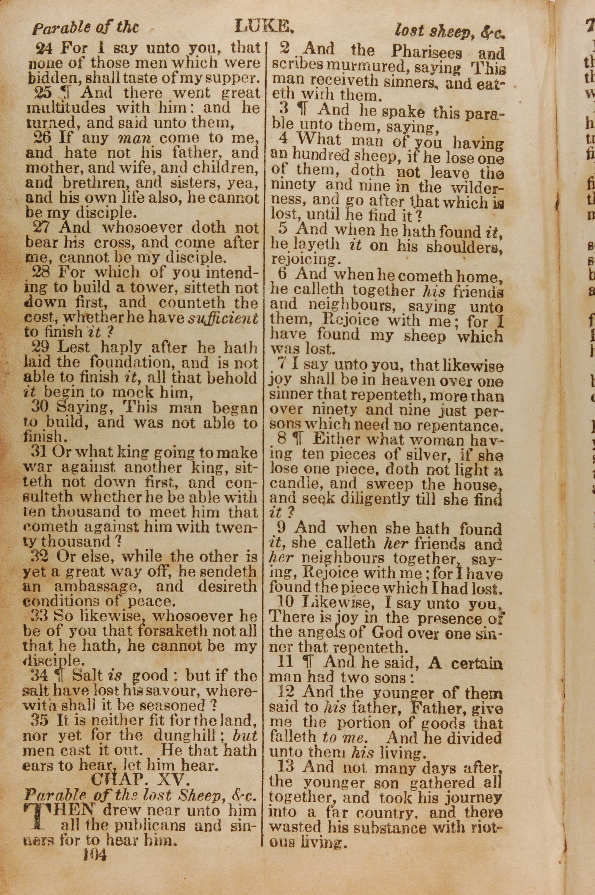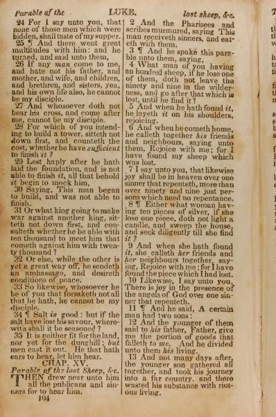 1843年The New Testament 路加福音 14 章 24 节到 15 章 13 节