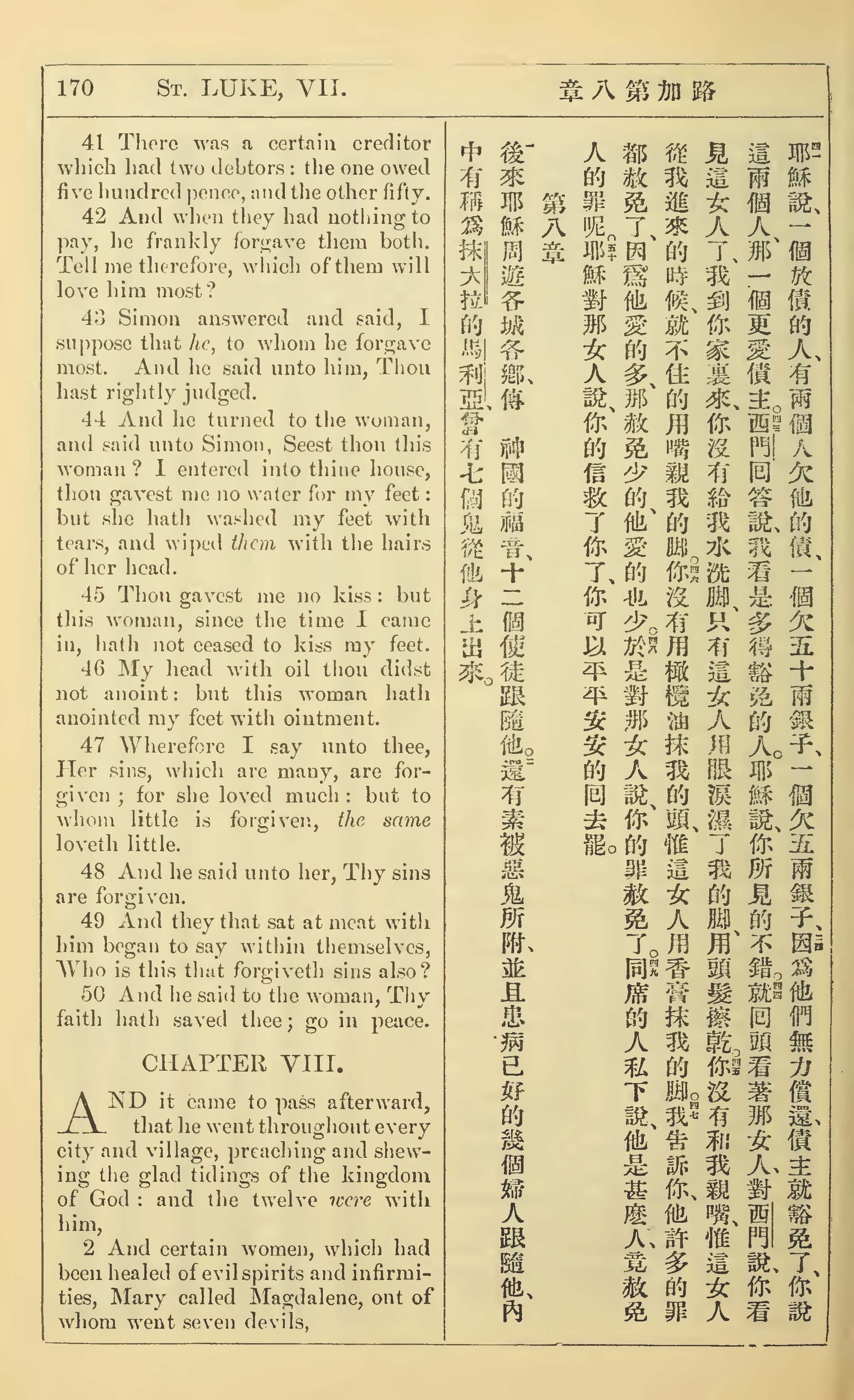 1902年新约全书(中英对照) 路加福音 7 章 41 节到 8 章 2 节