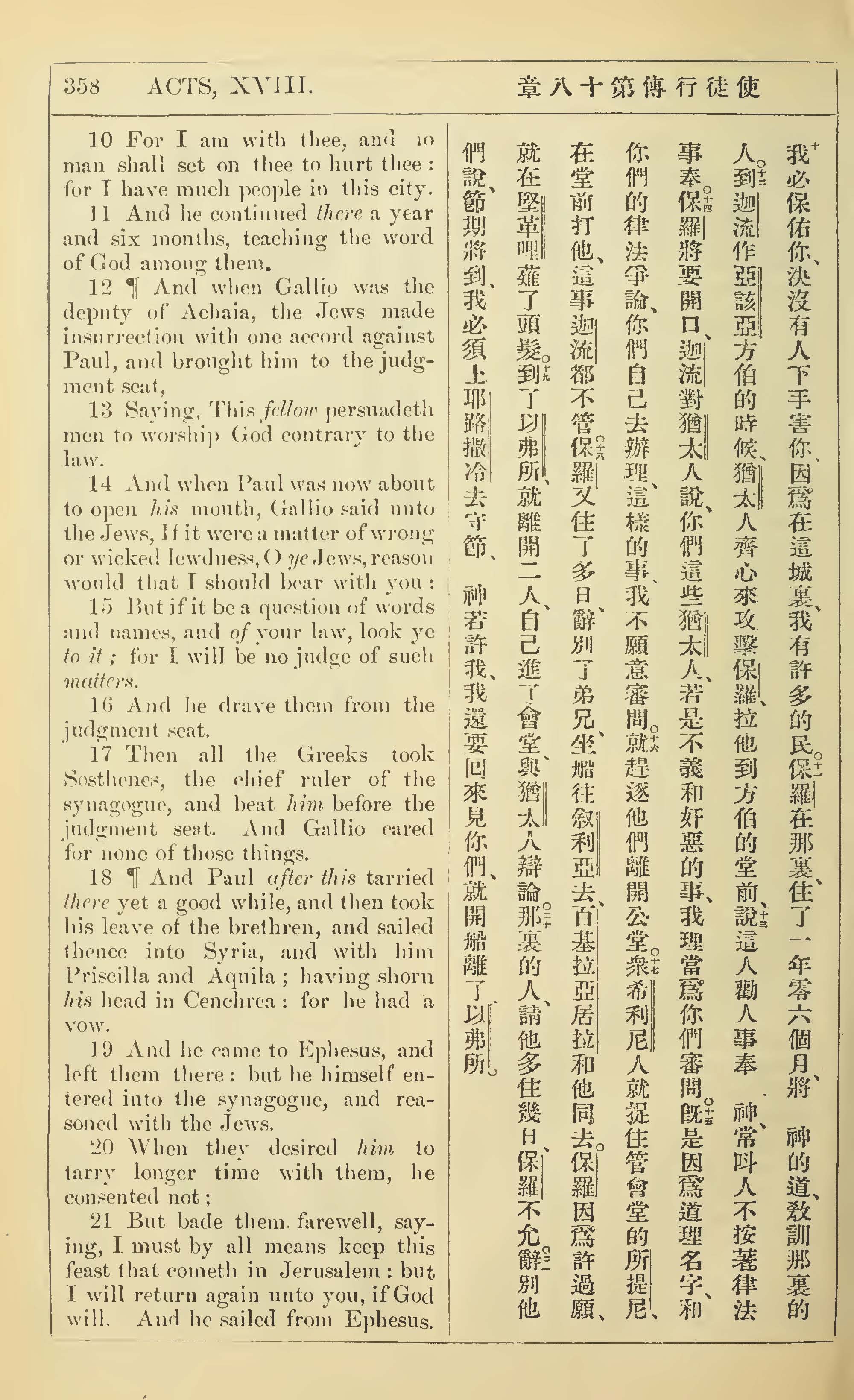 1902年新约全书(中英对照) 使徒行传 18 章 10 节到 18 章 21 节