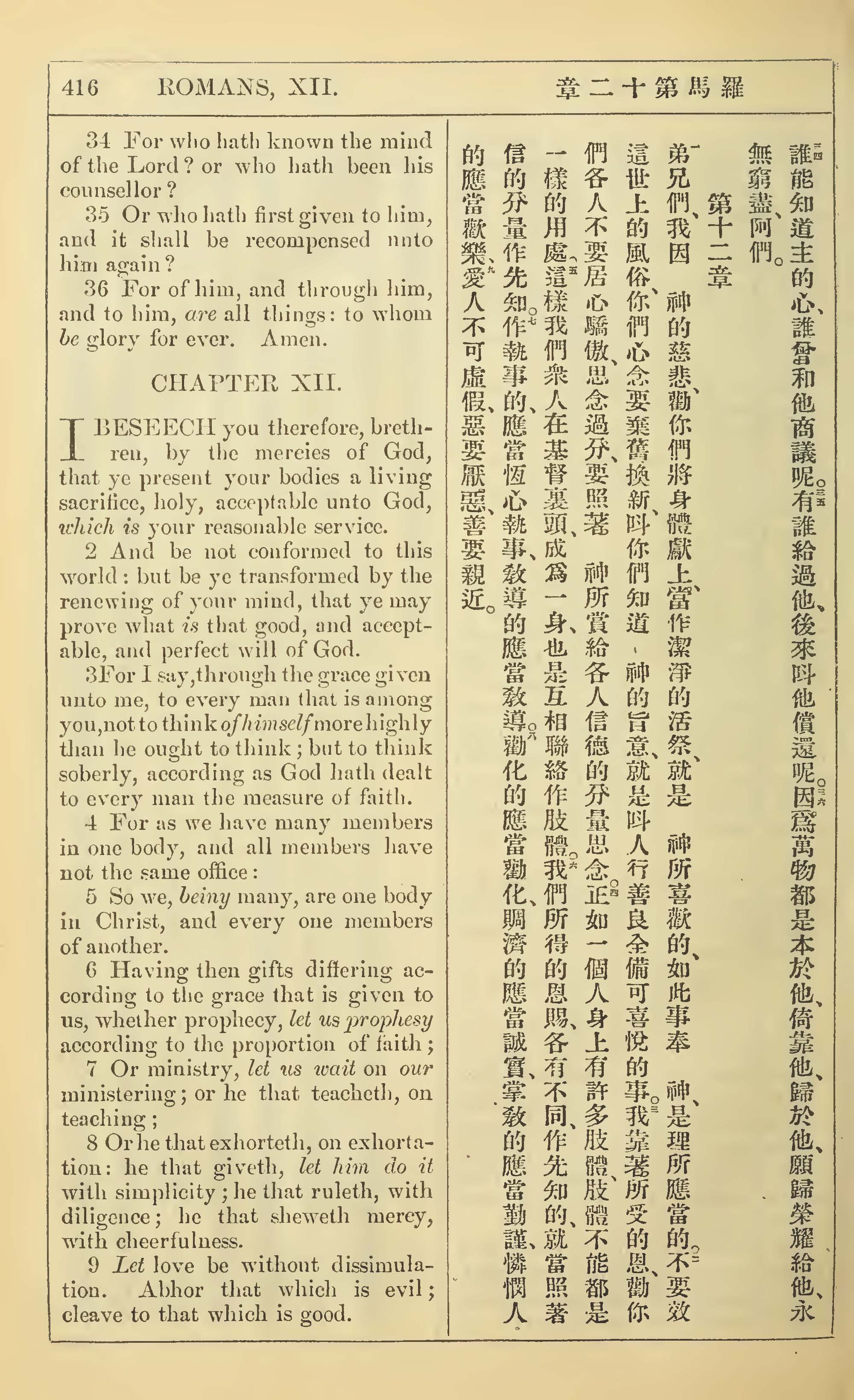 1902年新约全书(中英对照) 罗马书 11 章 34 节到 12 章 9 节