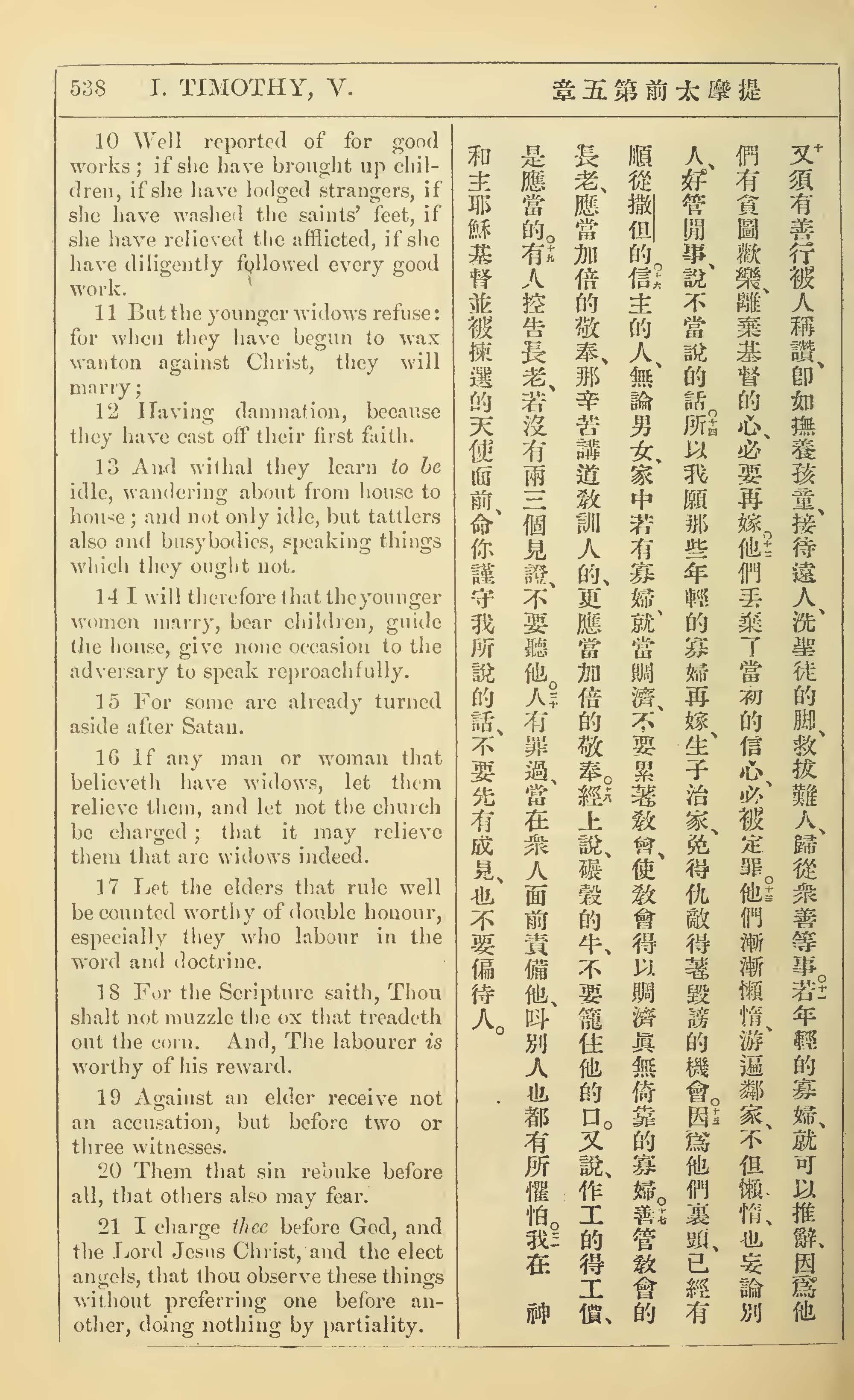 1902年新约全书(中英对照) 提摩太前书 5 章 10 节到 5 章 21 节