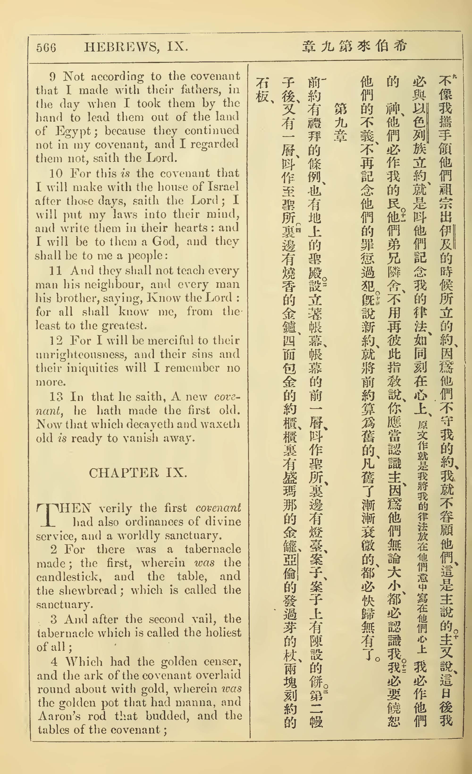 1902年新约全书(中英对照) 希伯来书 8 章 9 节到 9 章 4 节