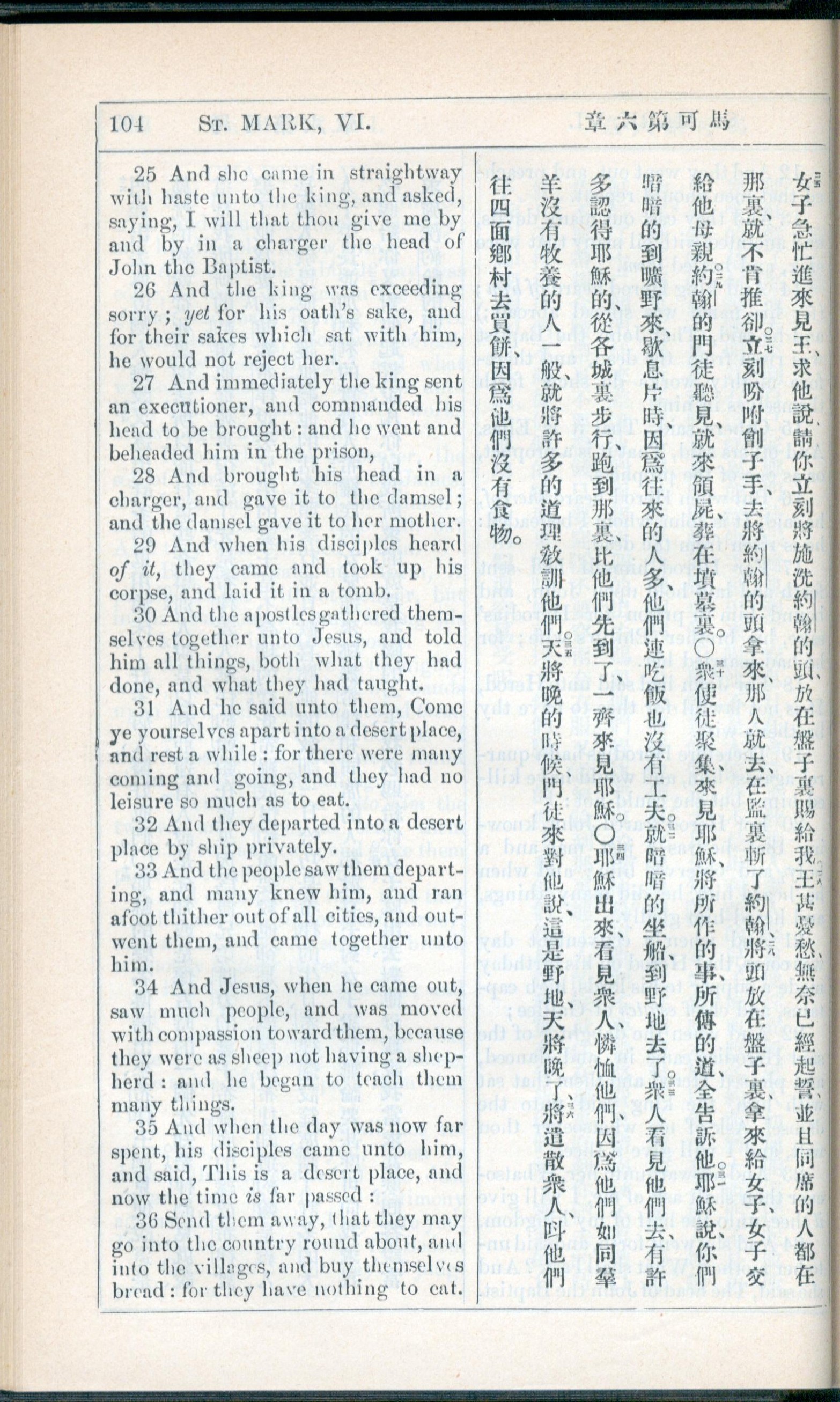 1908年新约全书(中西字) 马可福音 6 章 25 节到 6 章 36 节