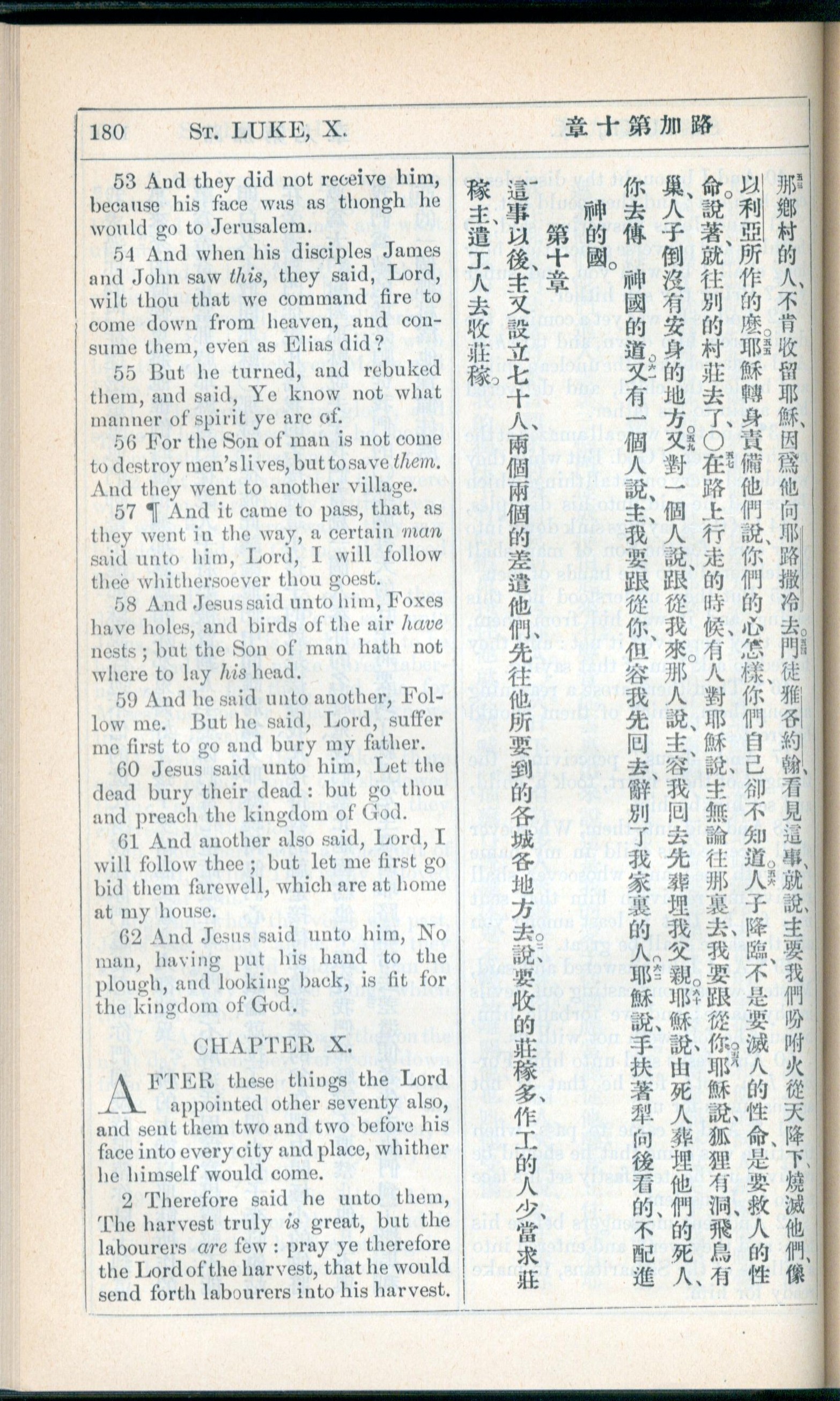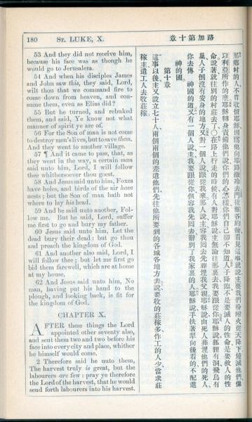 1908年新约全书(中西字) 路加福音 9 章 53 节到 10 章 2 节