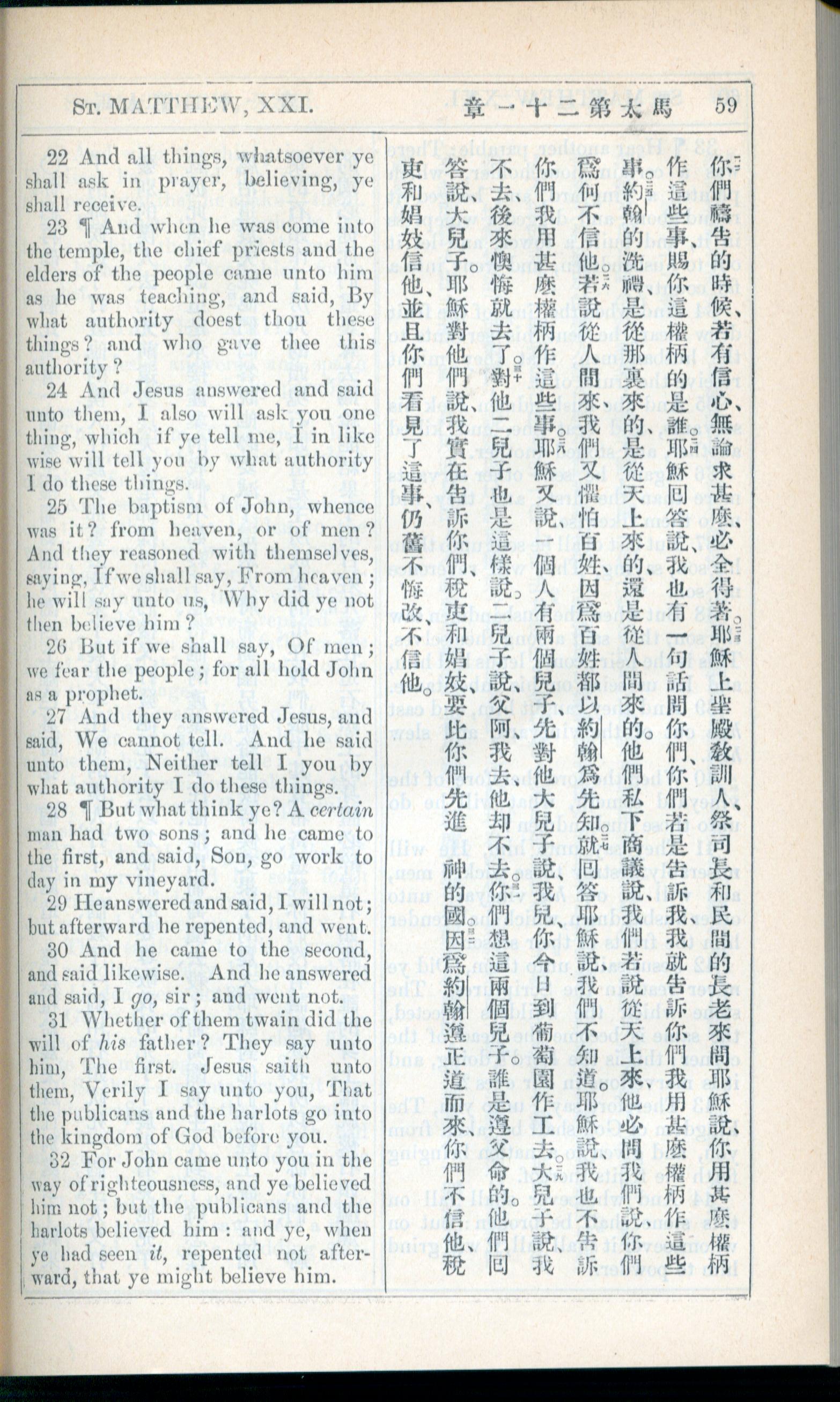 1908年新约全书(中西字) 马太福音 21 章 22 节到 21 章 32 节