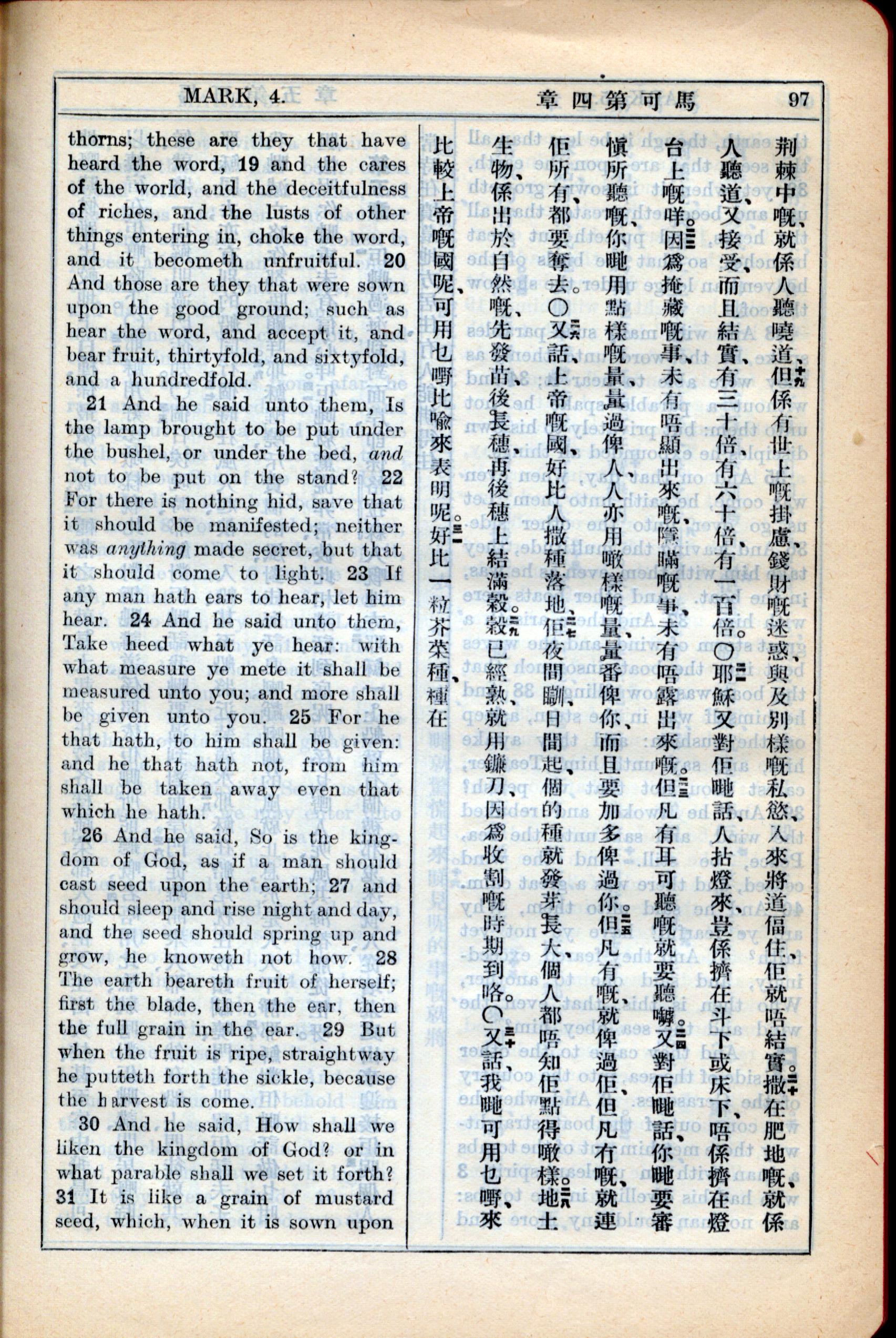 1931年新约全书广东话新译本与美国新译英文 马可福音 4 章 19 节到 4 章 31 节