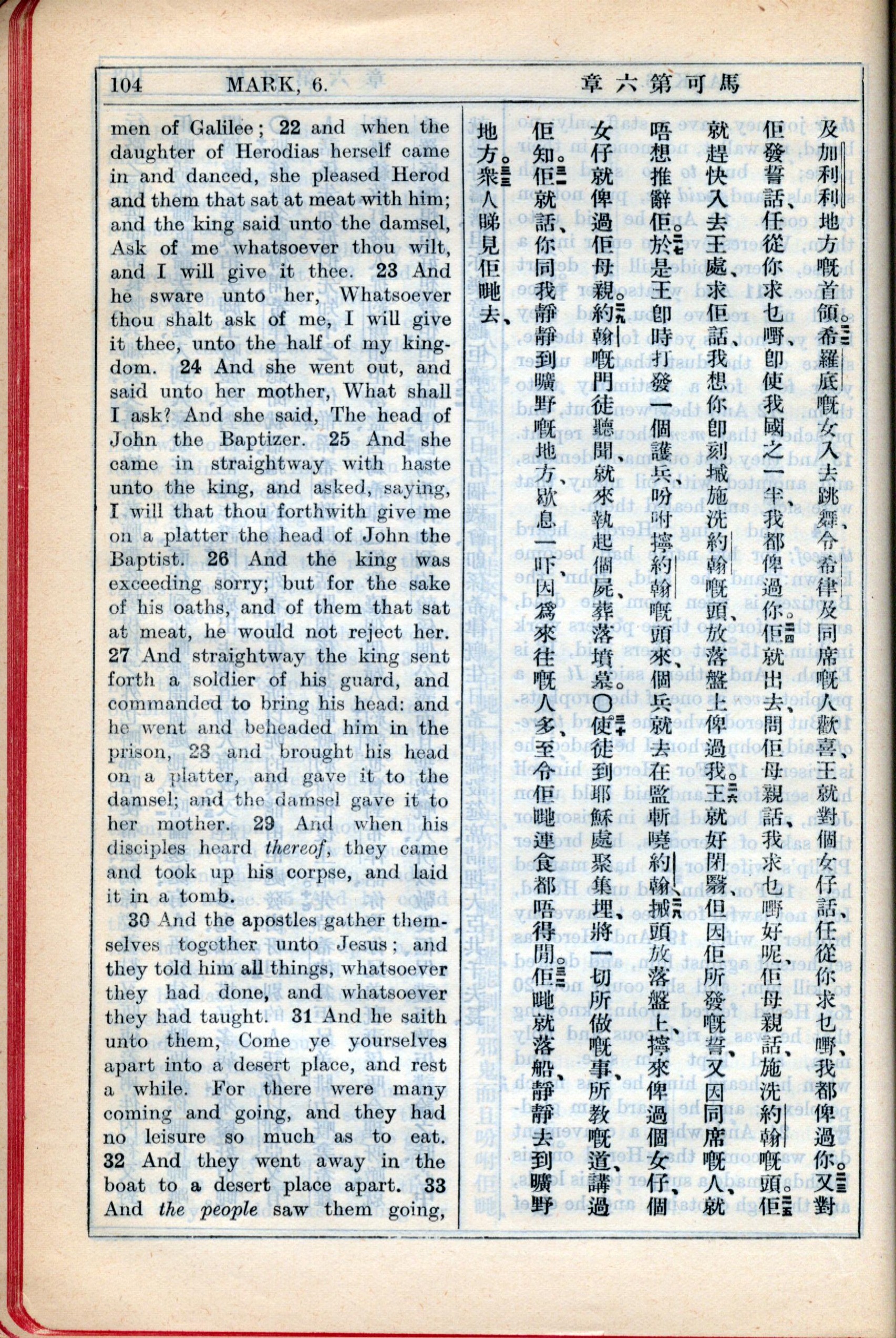 1931年新约全书广东话新译本与美国新译英文 马可福音 6 章 22 节到 6 章 32 节
