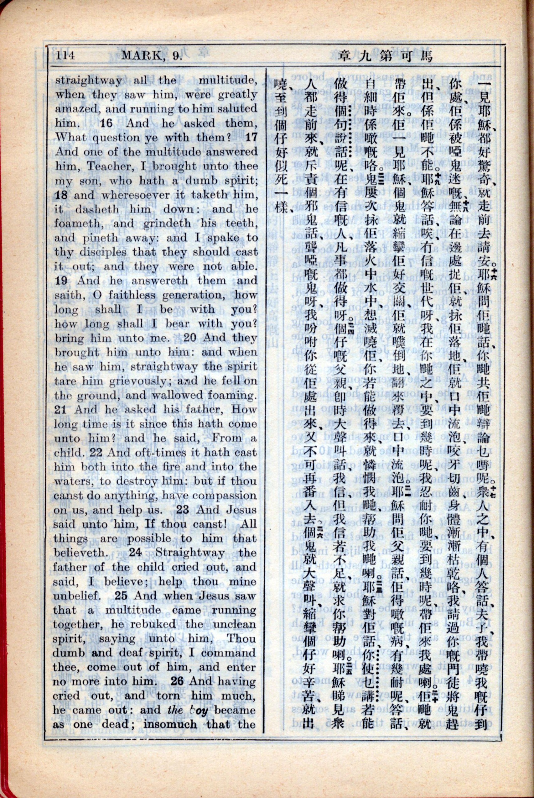 1931年新约全书广东话新译本与美国新译英文 马可福音 9 章 15 节到 9 章 26 节
