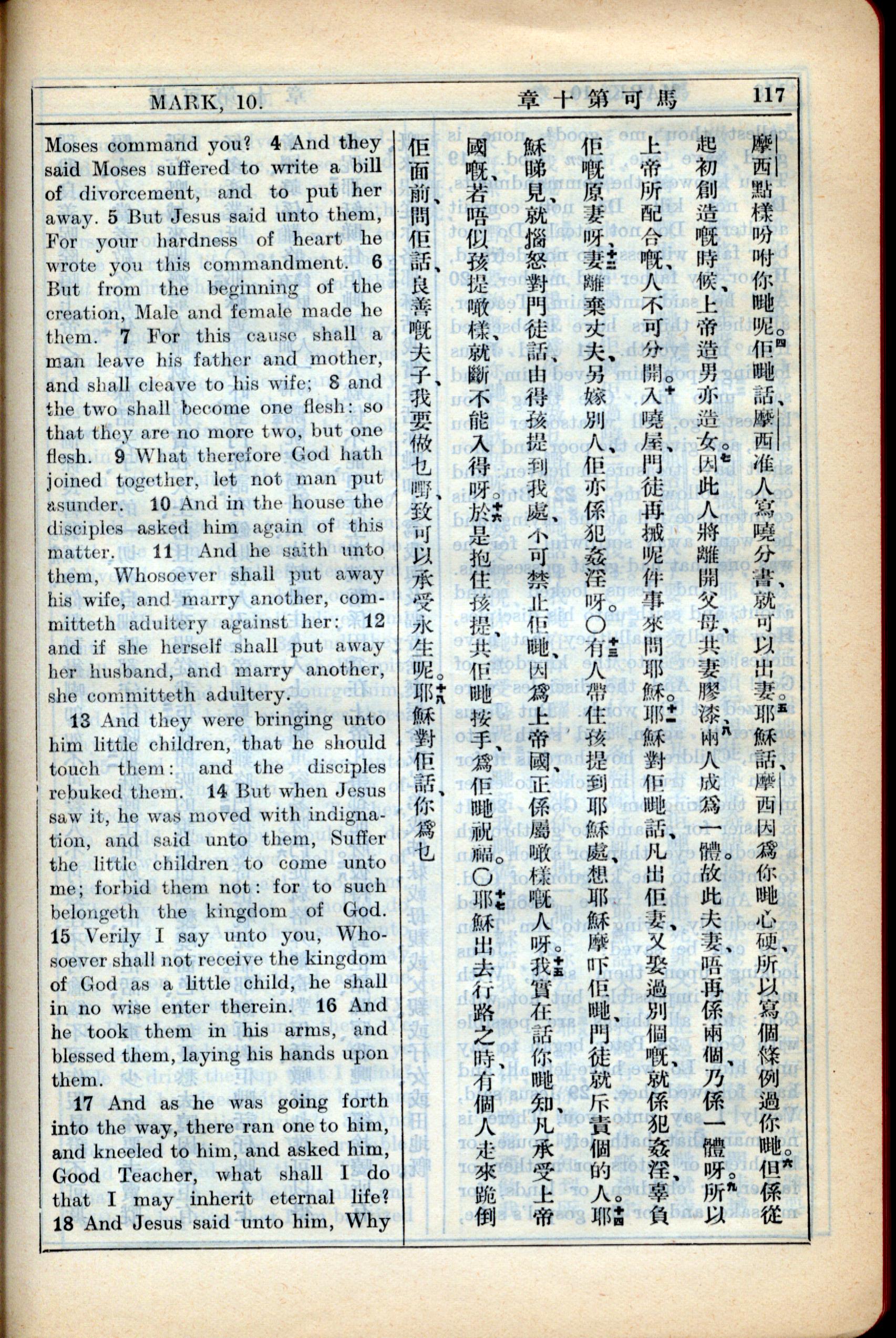 1931年新约全书广东话新译本与美国新译英文 马可福音 10 章 4 节到 10 章 18 节