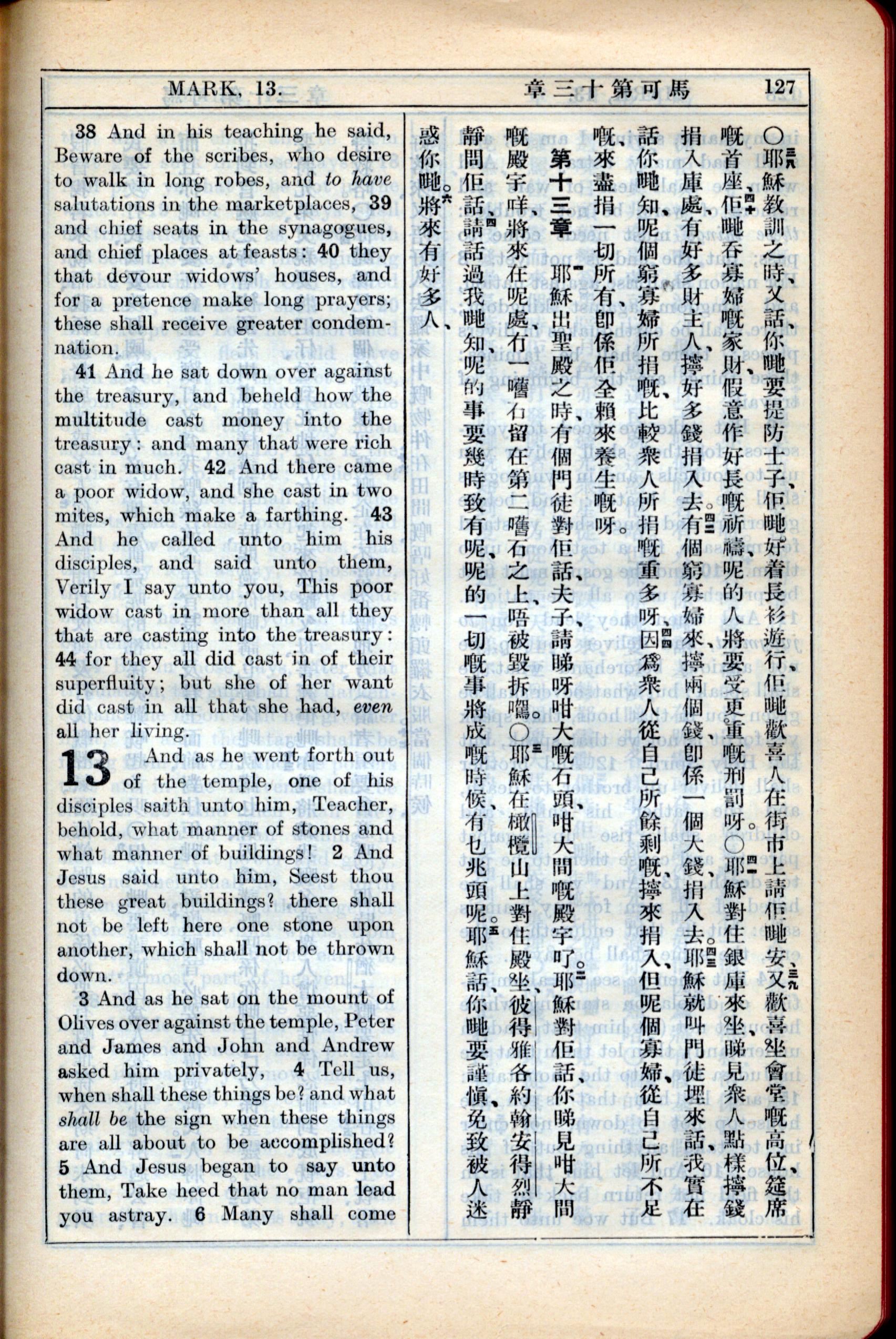 1931年新约全书广东话新译本与美国新译英文 马可福音 12 章 38 节到 13 章 5 节