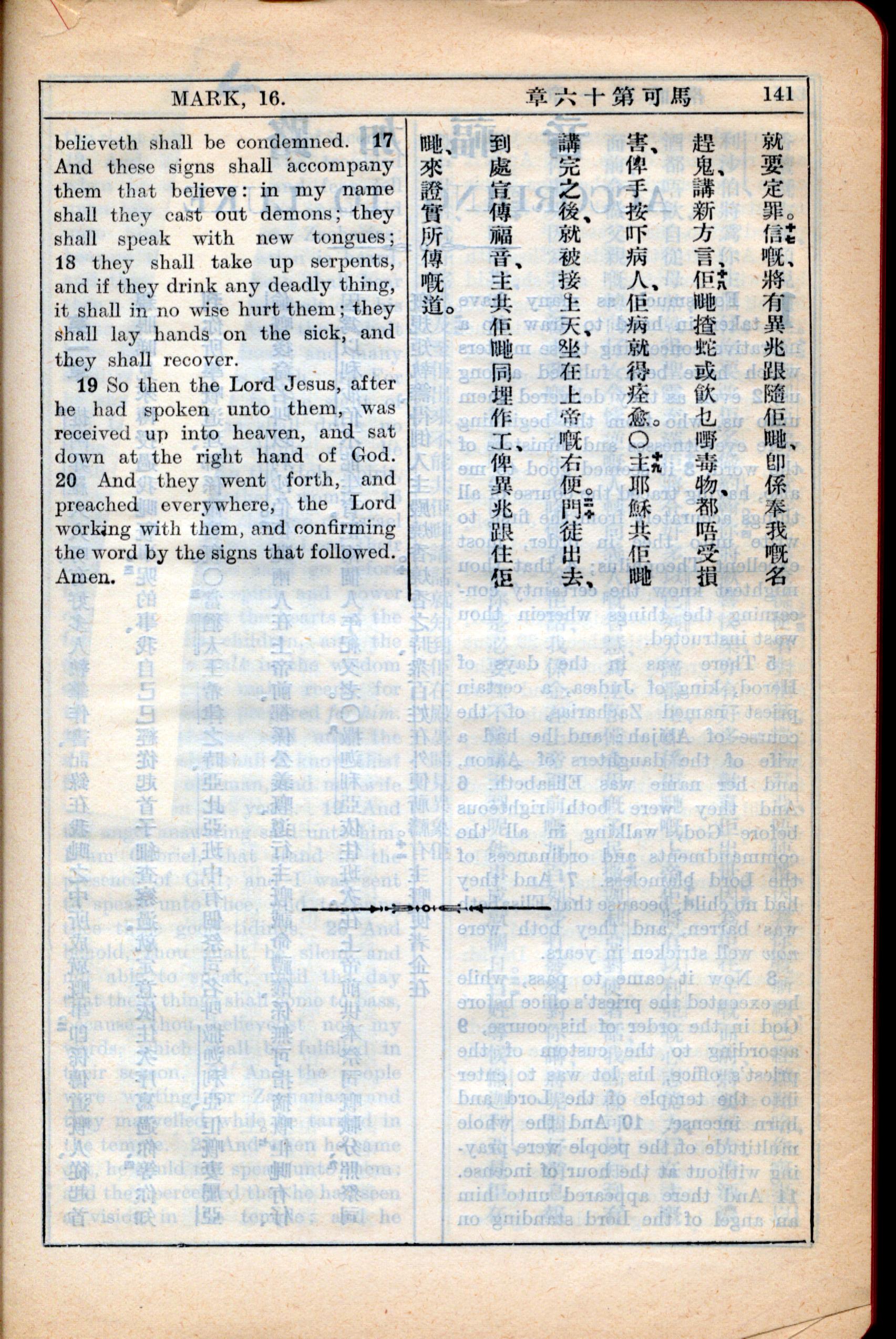 1931年新约全书广东话新译本与美国新译英文 马可福音 16 章 17 节到 16 章 20 节