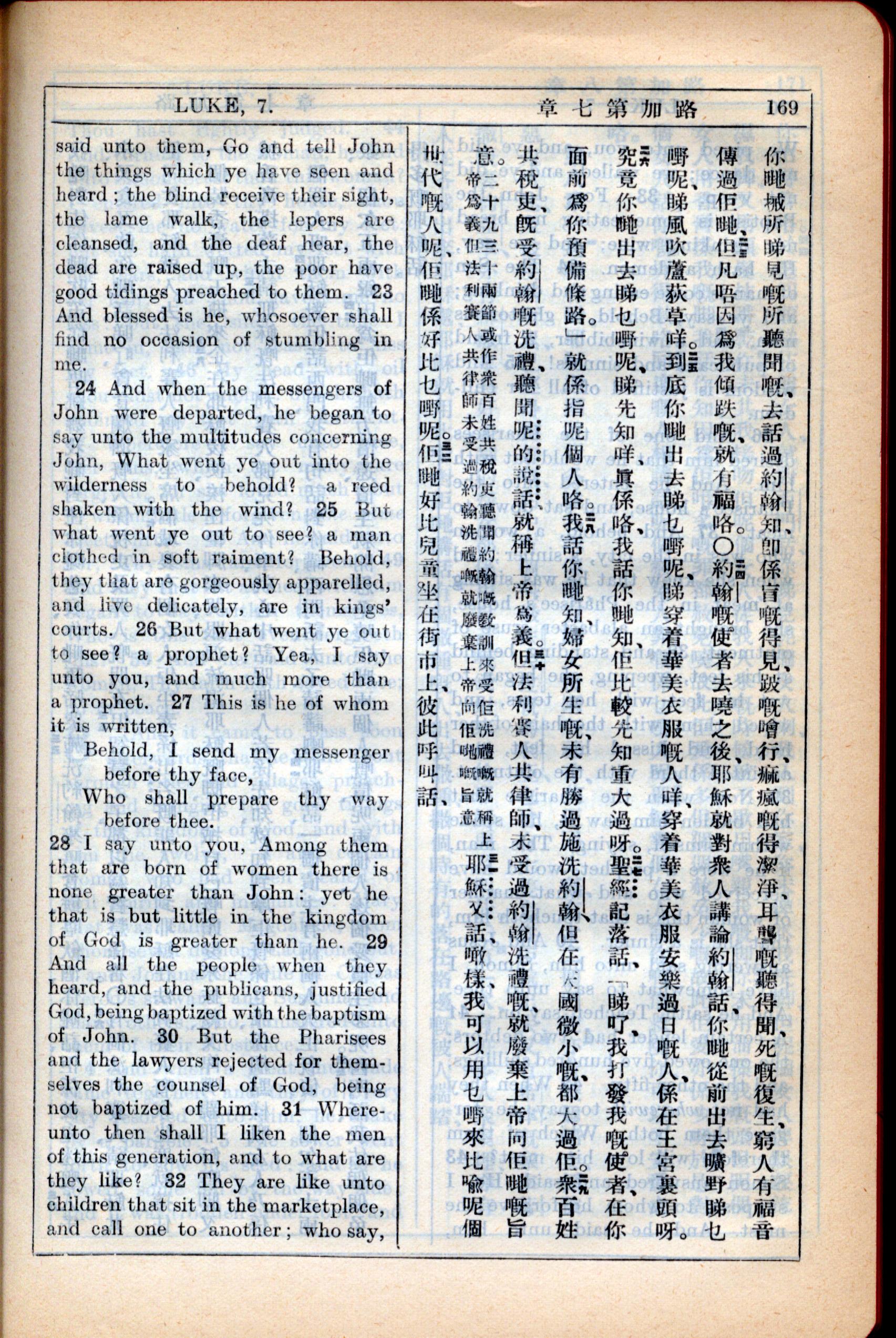 1931年新约全书广东话新译本与美国新译英文 路加福音 7 章 22 节到 7 章 32 节