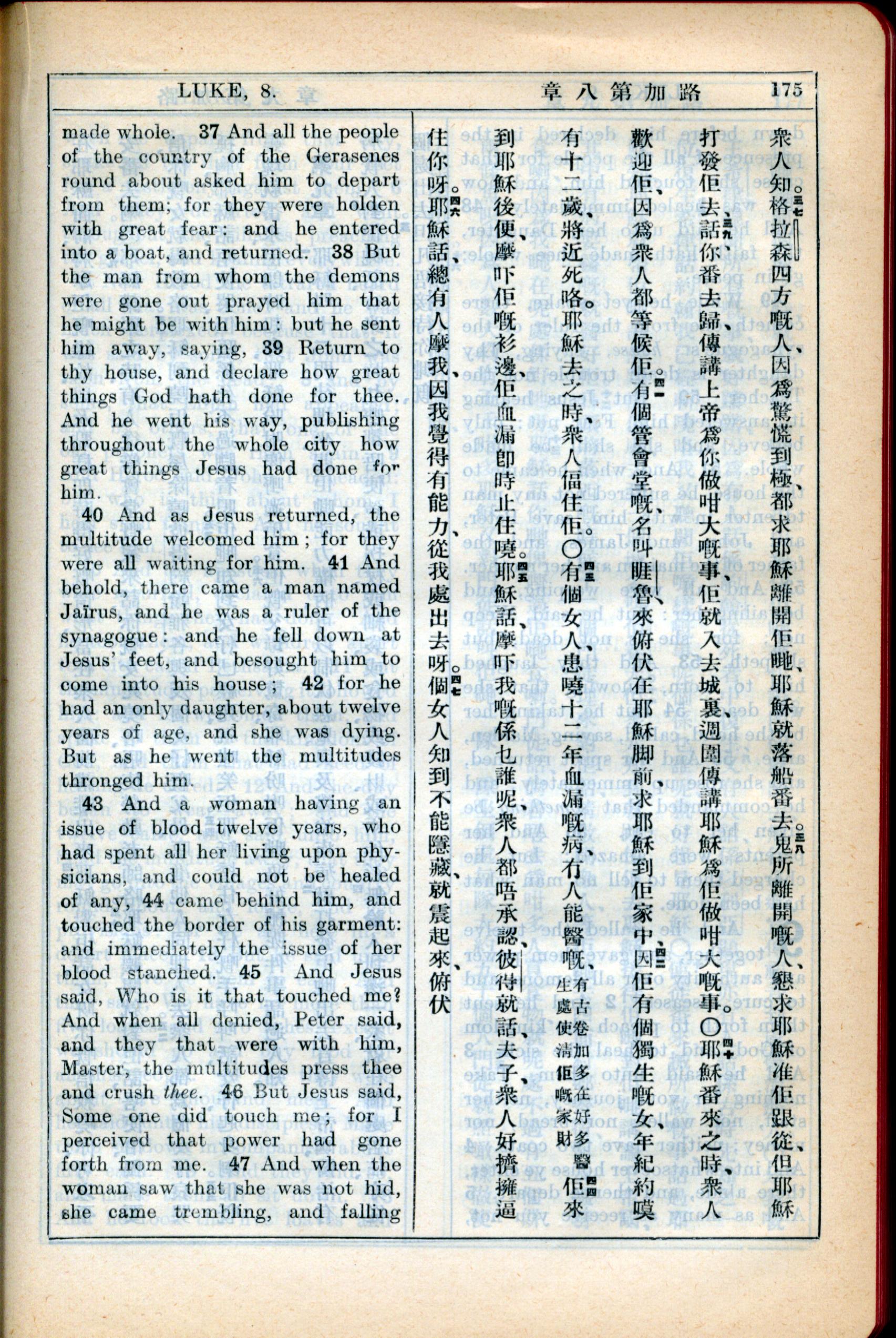 1931年新约全书广东话新译本与美国新译英文 路加福音 8 章 37 节到 8 章 47 节