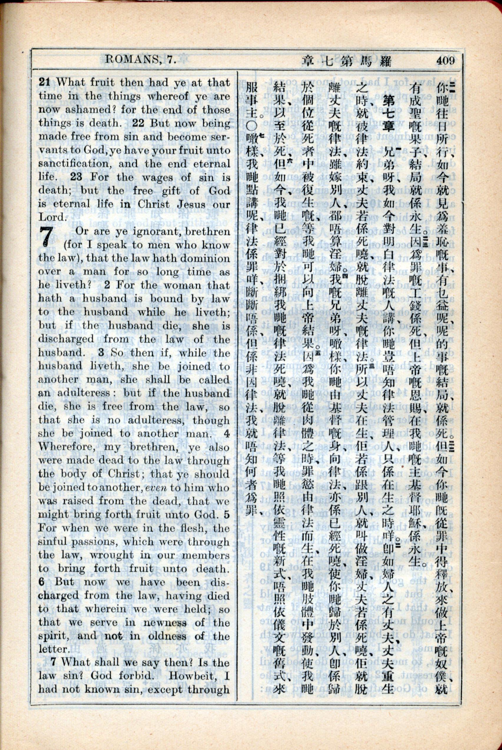 1931年新约全书广东话新译本与美国新译英文 罗马书 6 章 21 节到 7 章 7 节