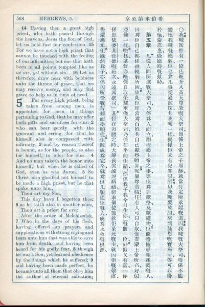 1931年新约全书广东话新译本与美国新译英文 希伯来书 4 章 14 节到 5 章 9 节