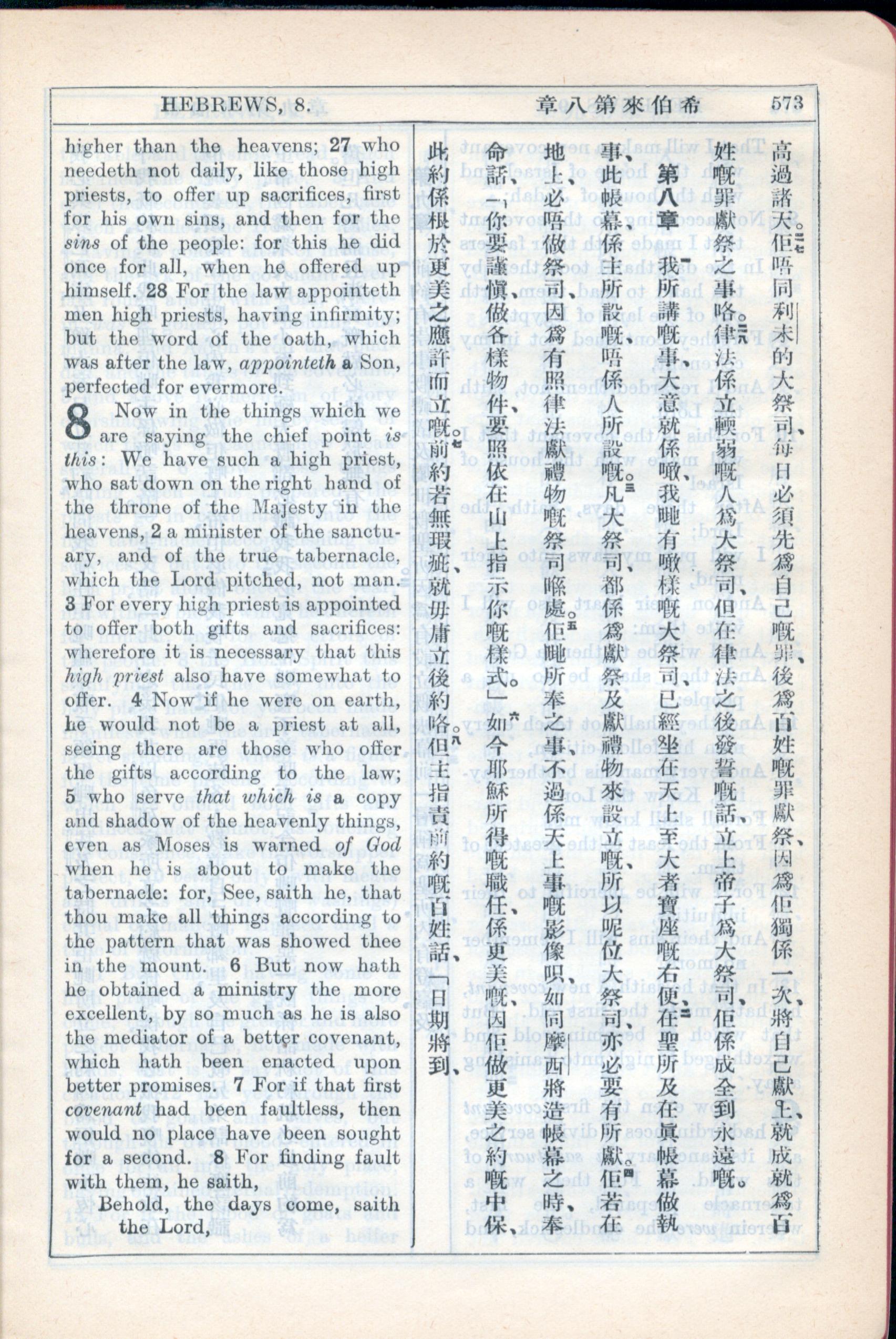 1931年新约全书广东话新译本与美国新译英文 希伯来书 7 章 27 节到 8 章 8 节