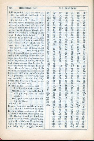 1931年新约全书广东话新译本与美国新译英文 希伯来书 10 章 7 节到 10 章 20 节