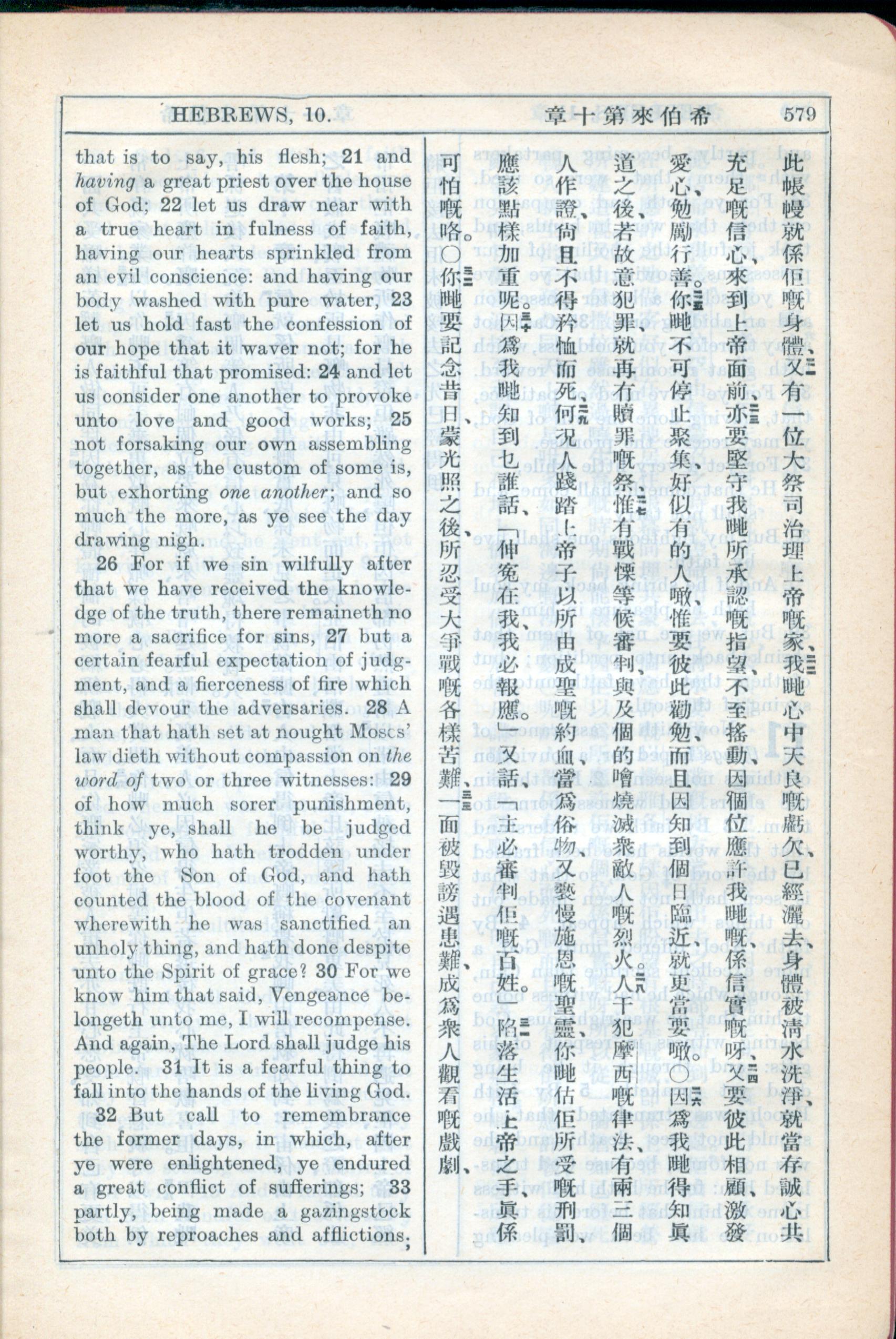 1931年新约全书广东话新译本与美国新译英文 希伯来书 10 章 21 节到 10 章 33 节