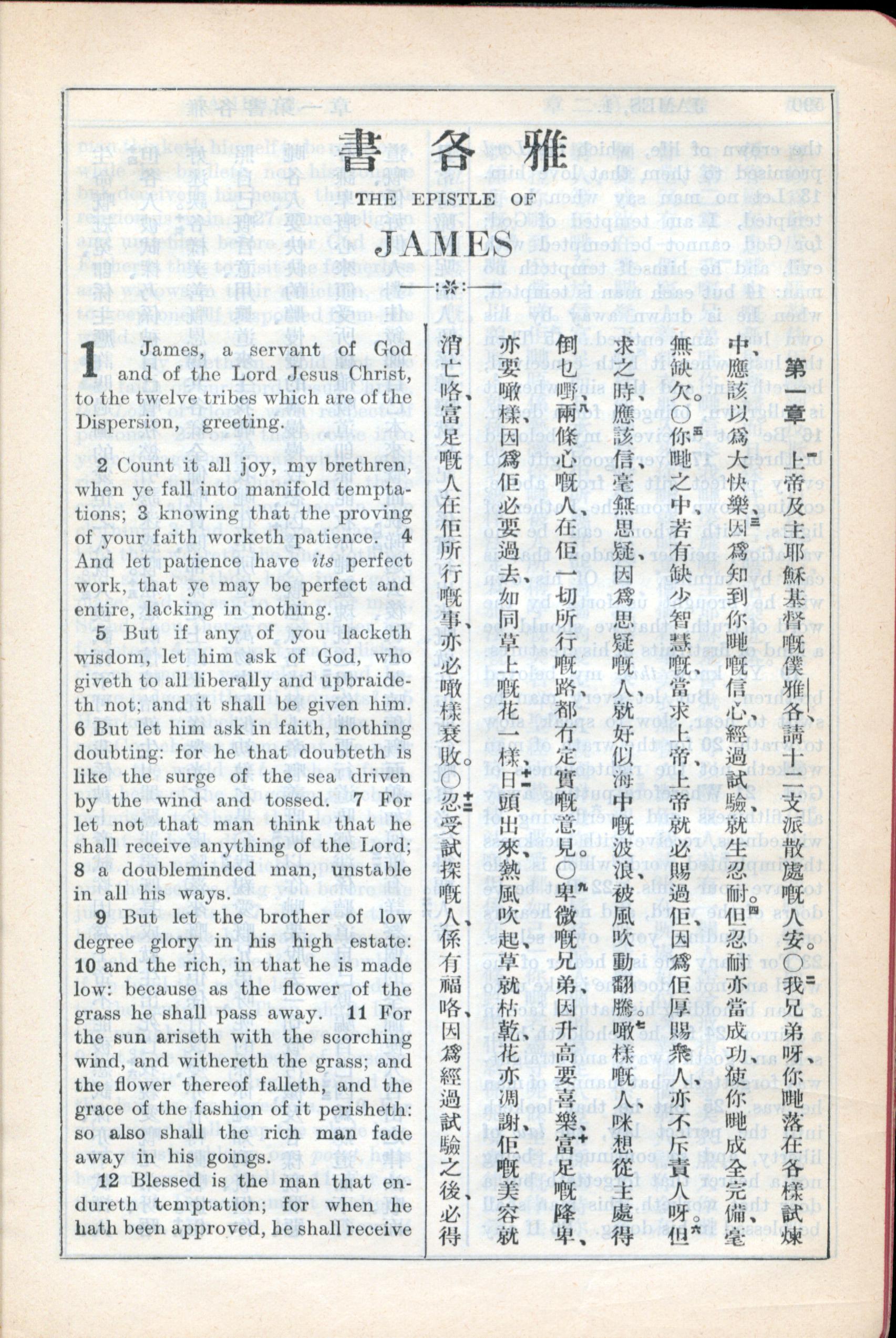 1931年新约全书广东话新译本与美国新译英文 雅各书 1 章 1 节到 1 章 12 节