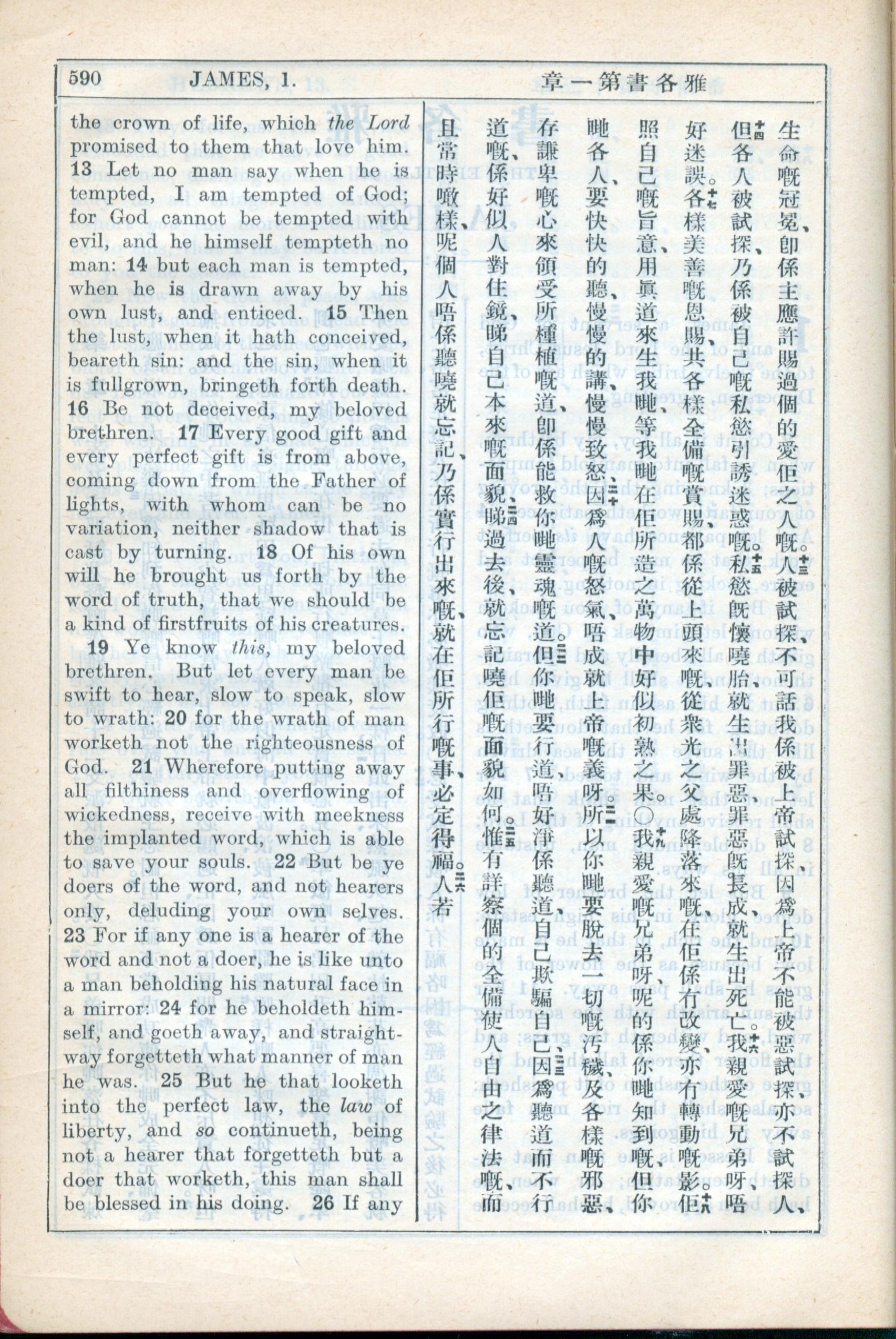 1931年新约全书广东话新译本与美国新译英文 雅各书 1 章 13 节到 1 章 25 节