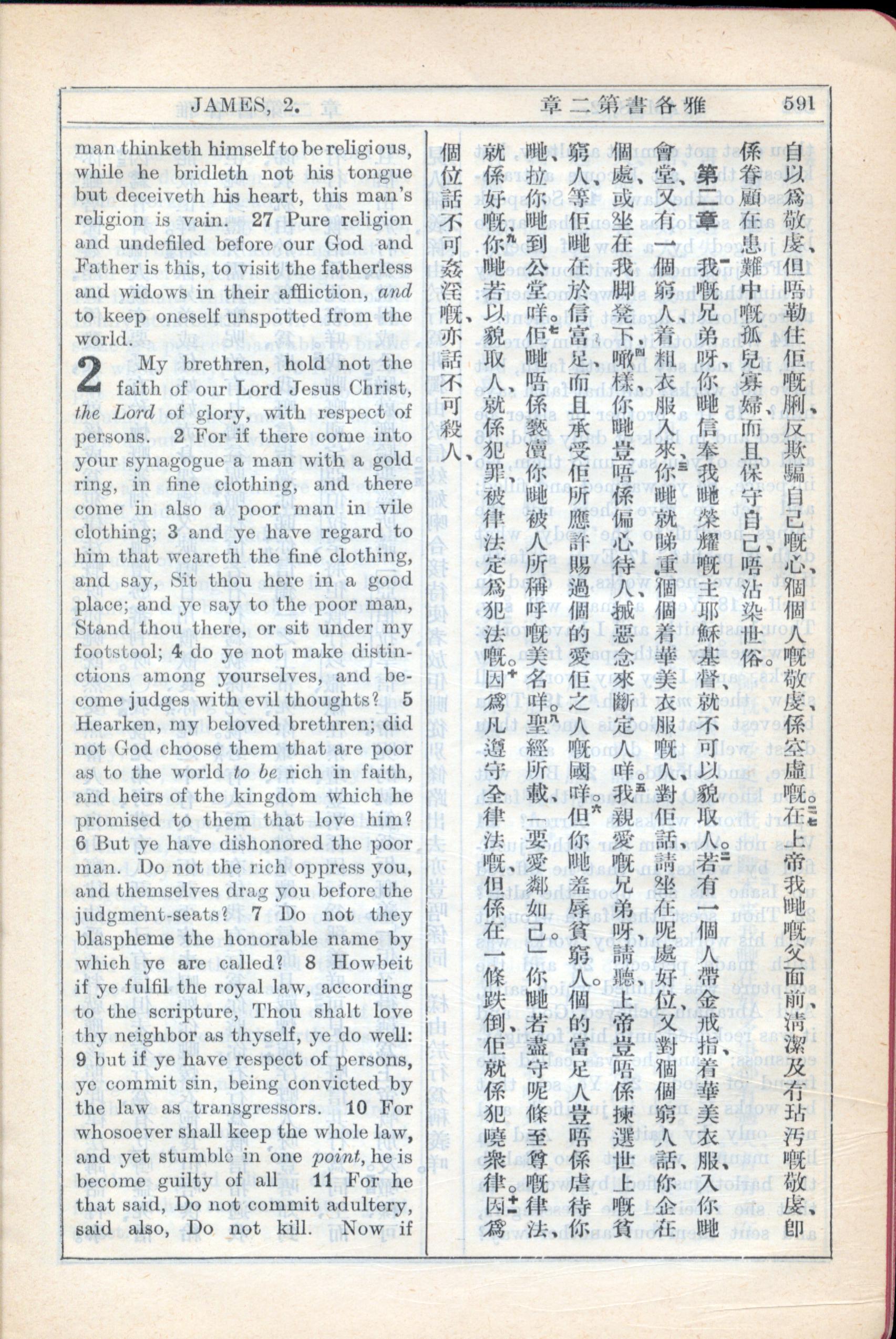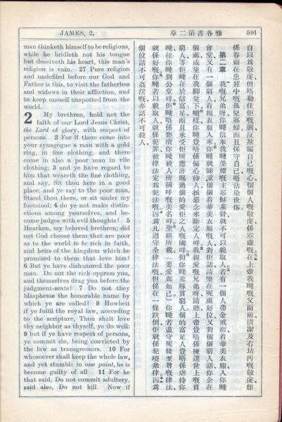 1931年新约全书广东话新译本与美国新译英文 雅各书 1 章 26 节到 2 章 11 节