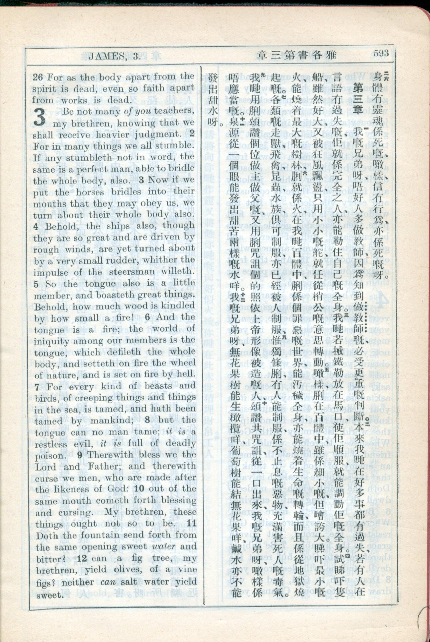 1931年新约全书广东话新译本与美国新译英文 雅各书 2 章 26 节到 3 章 12 节