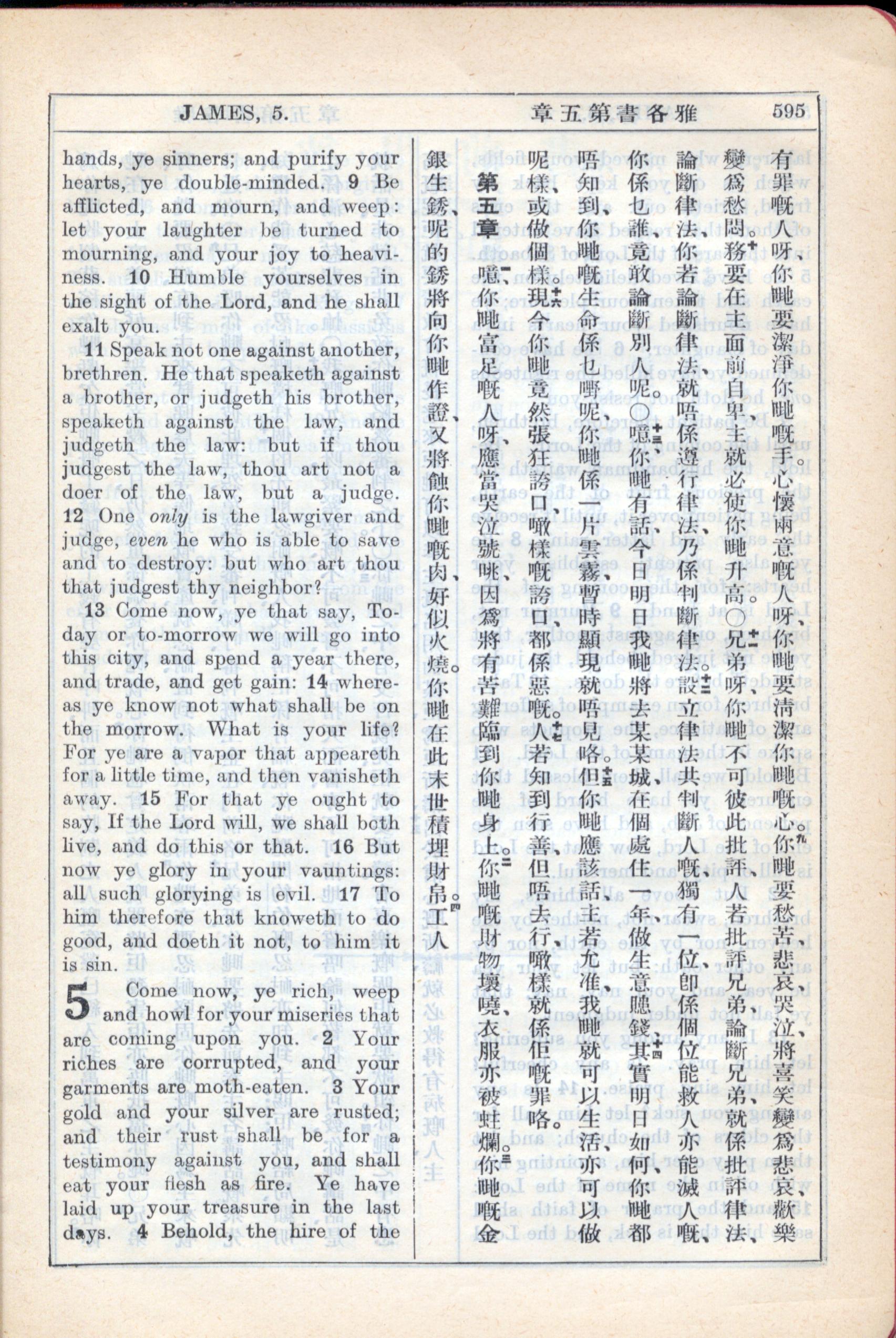 1931年新约全书广东话新译本与美国新译英文 雅各书 4 章 9 节到 5 章 3 节