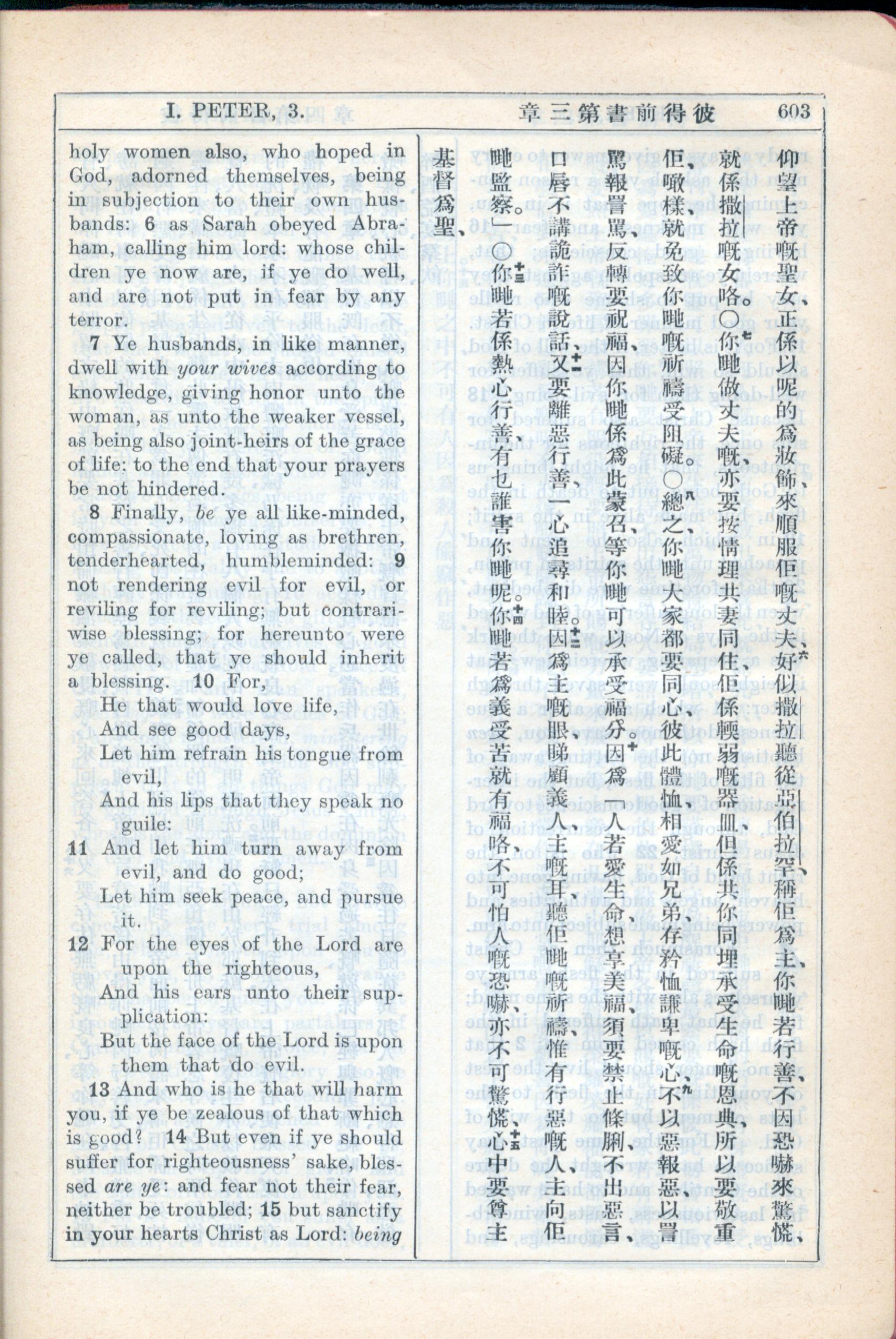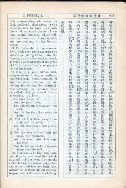 1931年新约全书广东话新译本与美国新译英文 彼得前书 3 章 6 节到 3 章 15 节
