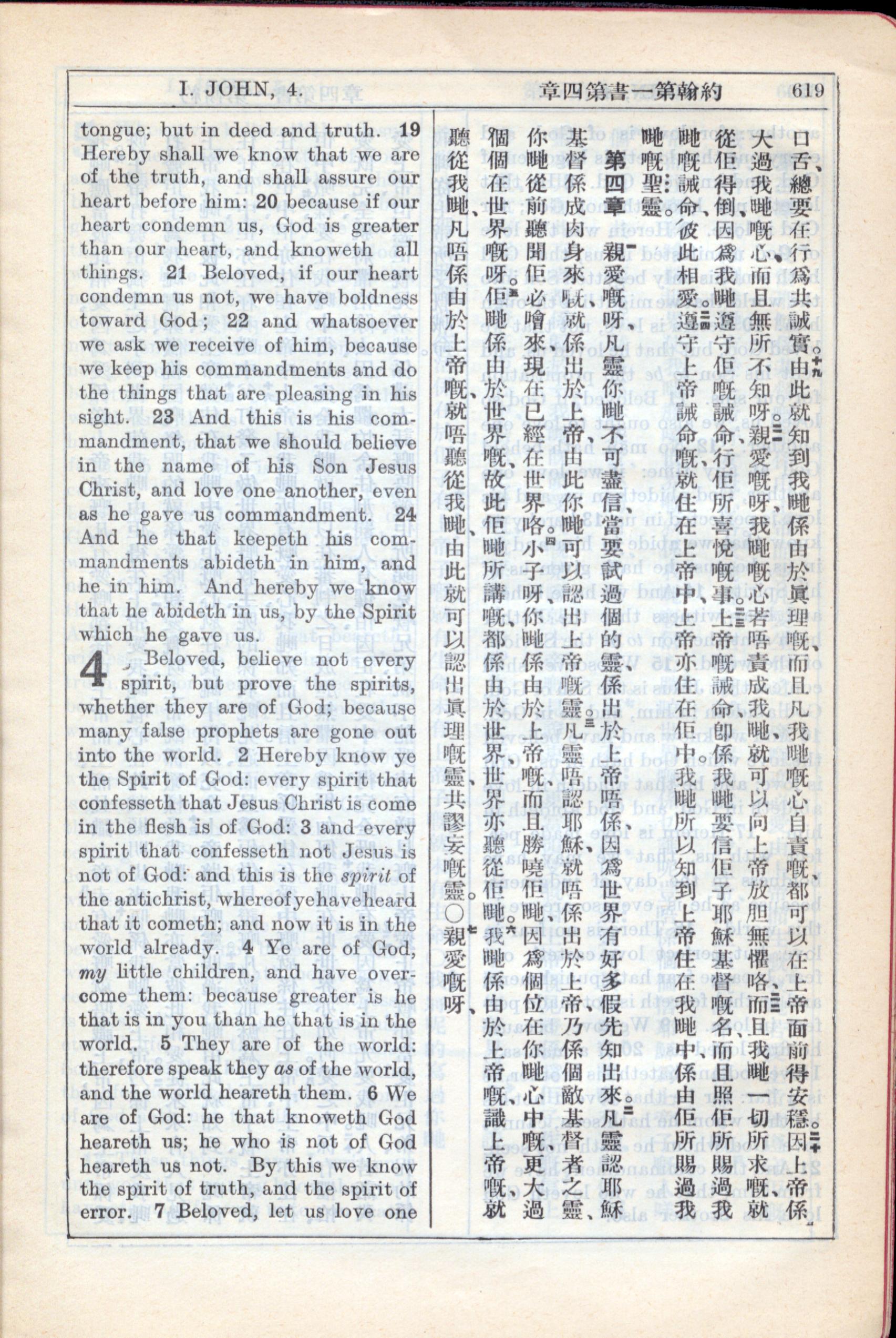 1931年新约全书广东话新译本与美国新译英文 约翰一书 3 章 19 节到 4 章 7 节