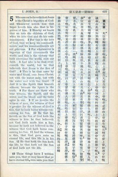 1931年新约全书广东话新译本与美国新译英文 约翰一书 5 章 1 节到 5 章 13 节