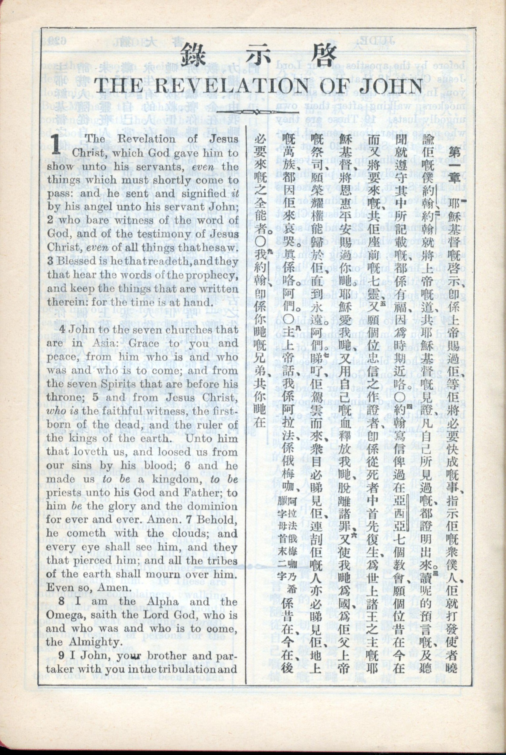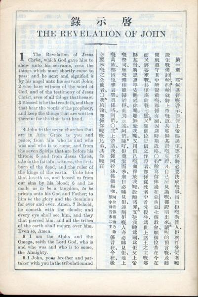 1931年新约全书广东话新译本与美国新译英文 启示录 1 章 1 节到 1 章 9 节