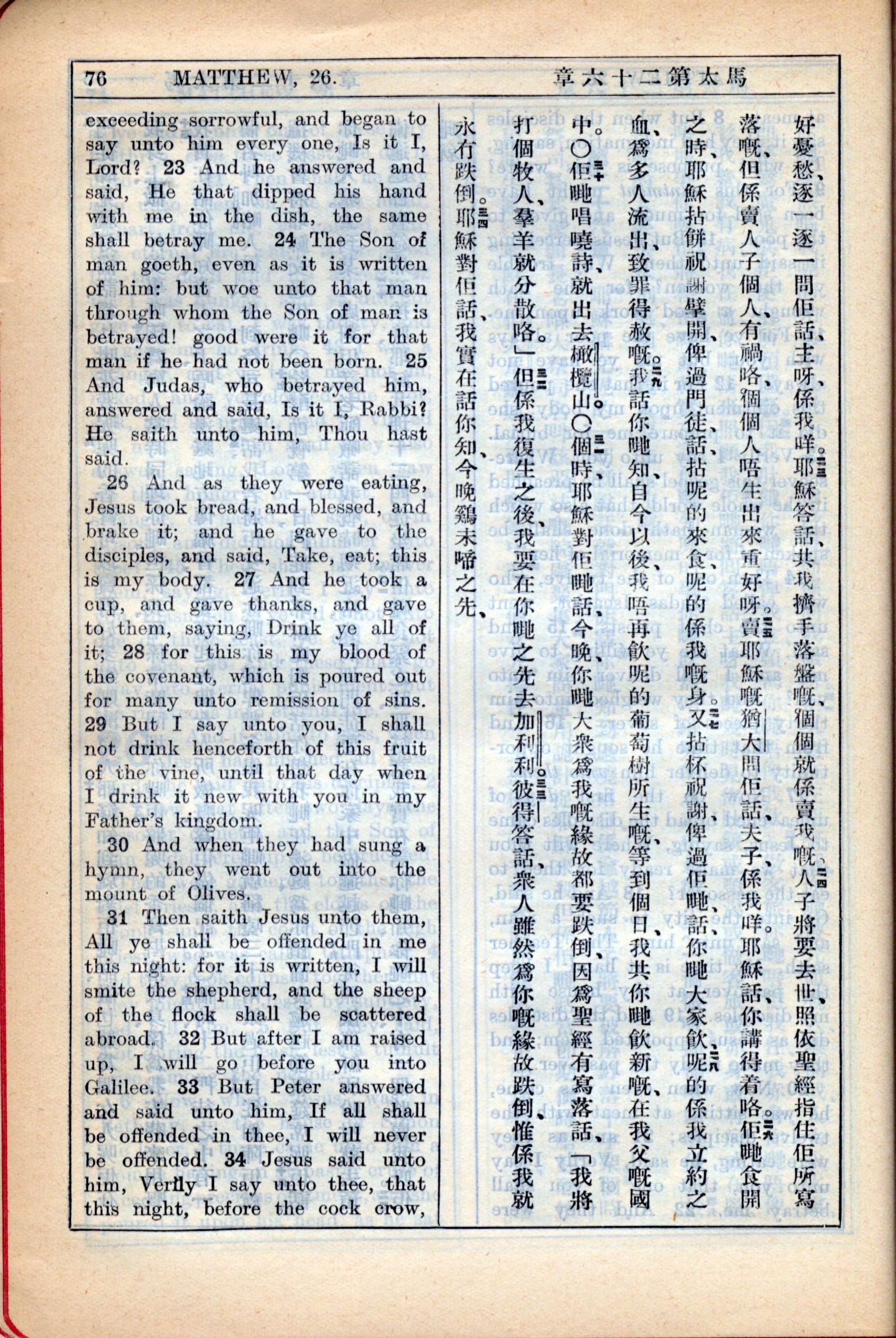 1931年新约全书广东话新译本与美国新译英文 马太福音 26 章 22 节到 26 章 34 节