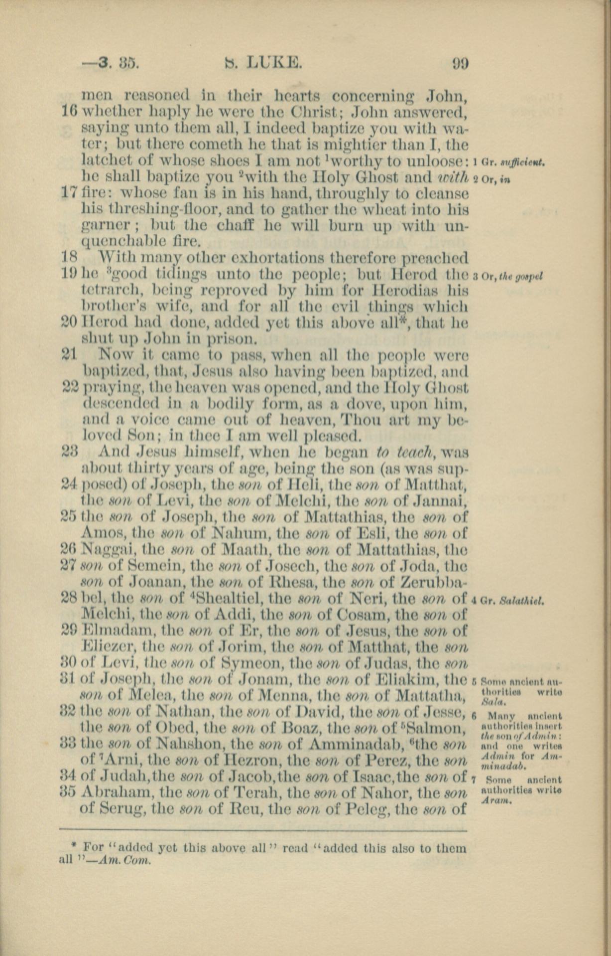 1881年New Testament 路加福音 3 章 16 节到 3 章 35 节