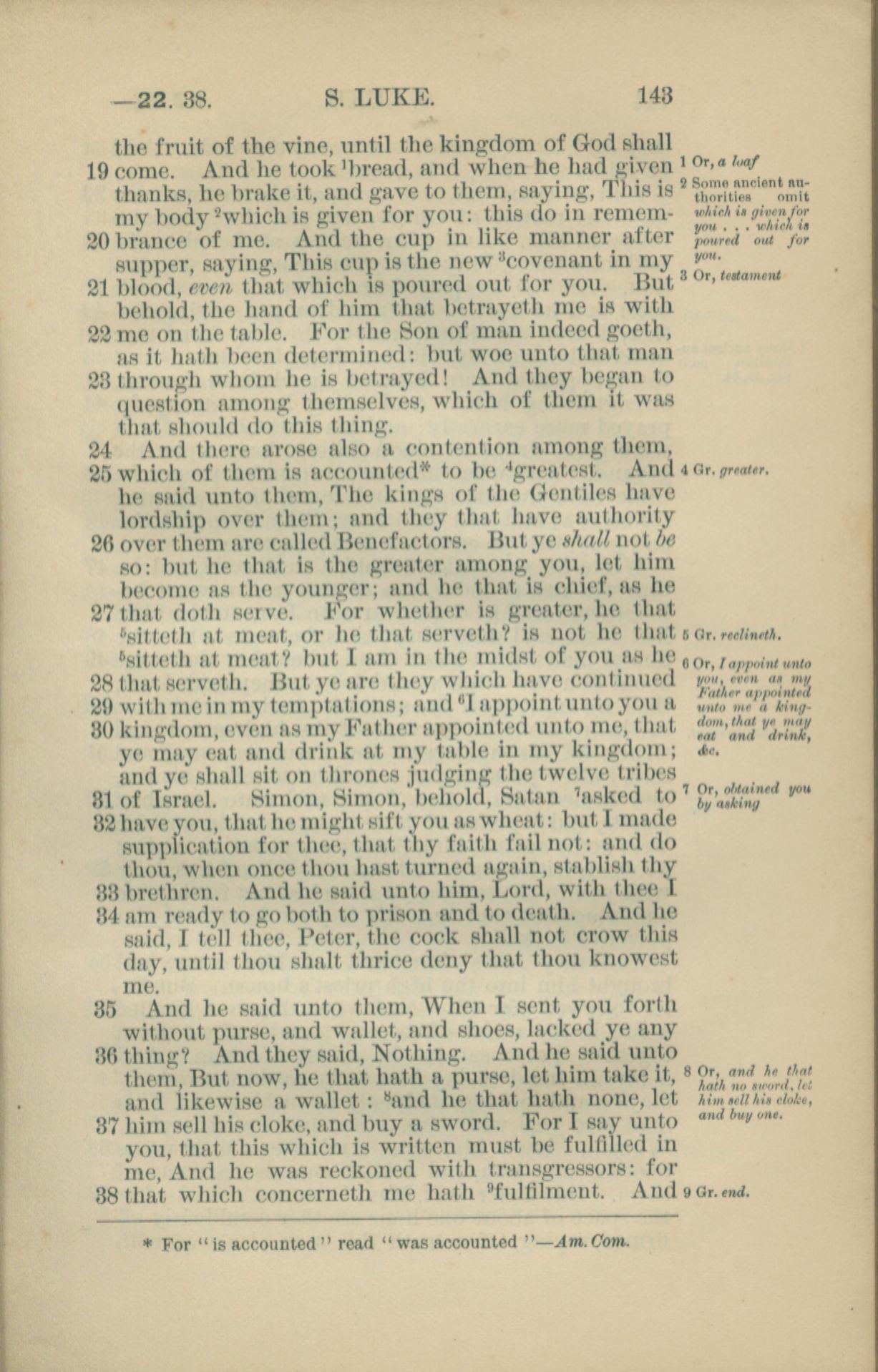 1881年New Testament 路加福音 22 章 19 节到 22 章 38 节