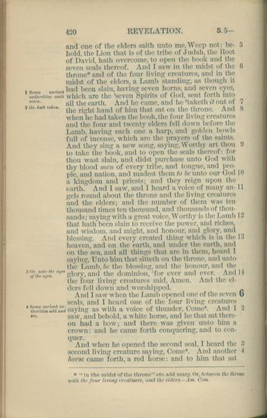 1881年New Testament 启示录 5 章 5 节到 6 章 4 节