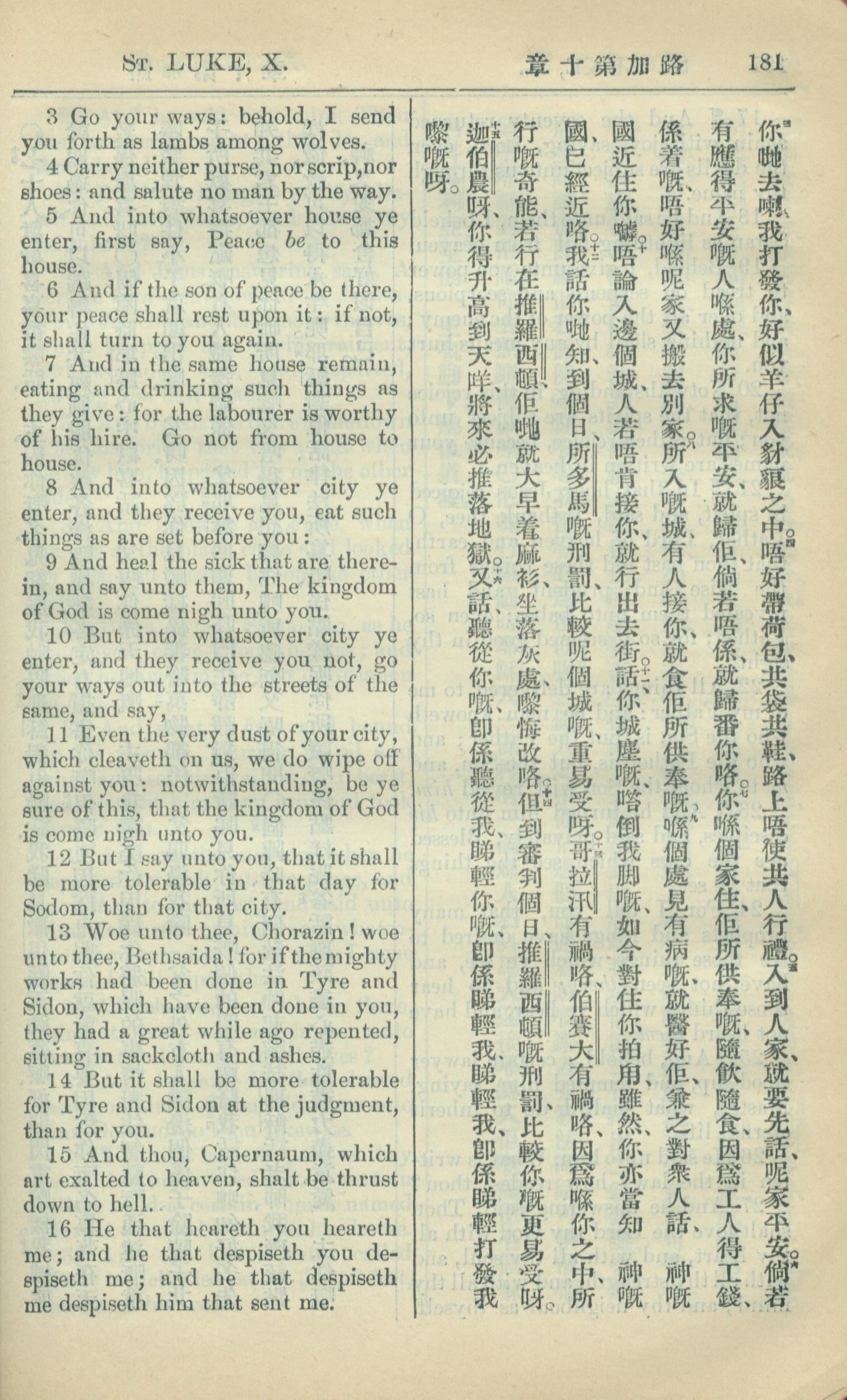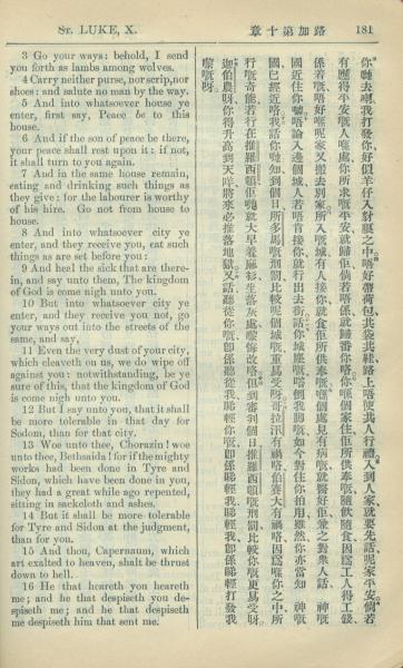 1909年中西字新约全书 路加福音 10 章 3 节到 10 章 16 节