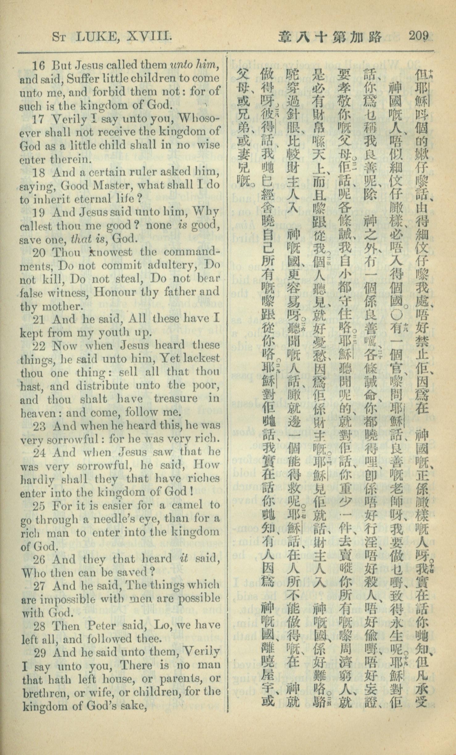 1909年中西字新约全书 路加福音 18 章 16 节到 18 章 29 节