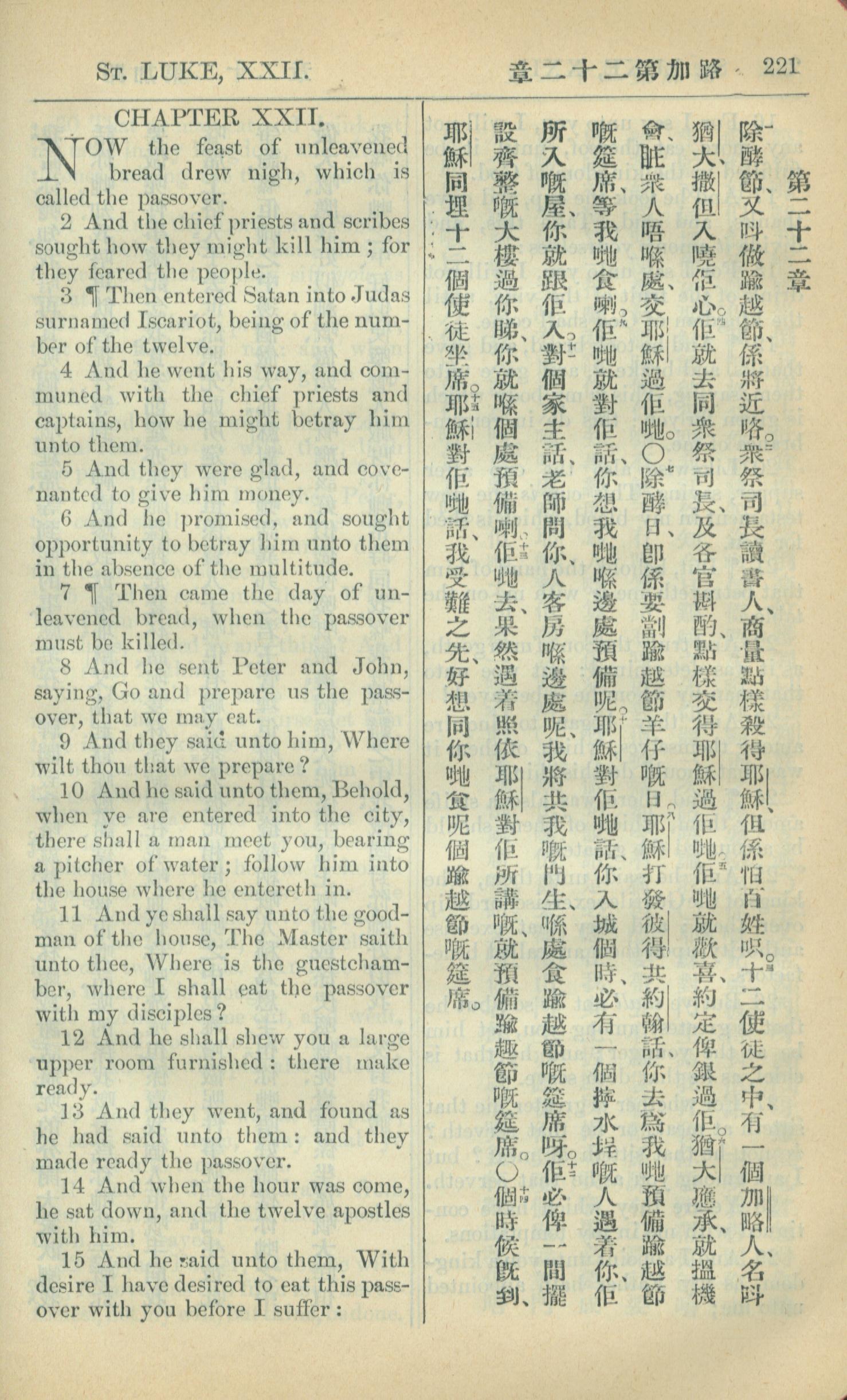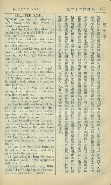 1909年中西字新约全书 路加福音 22 章 1 节到 22 章 15 节