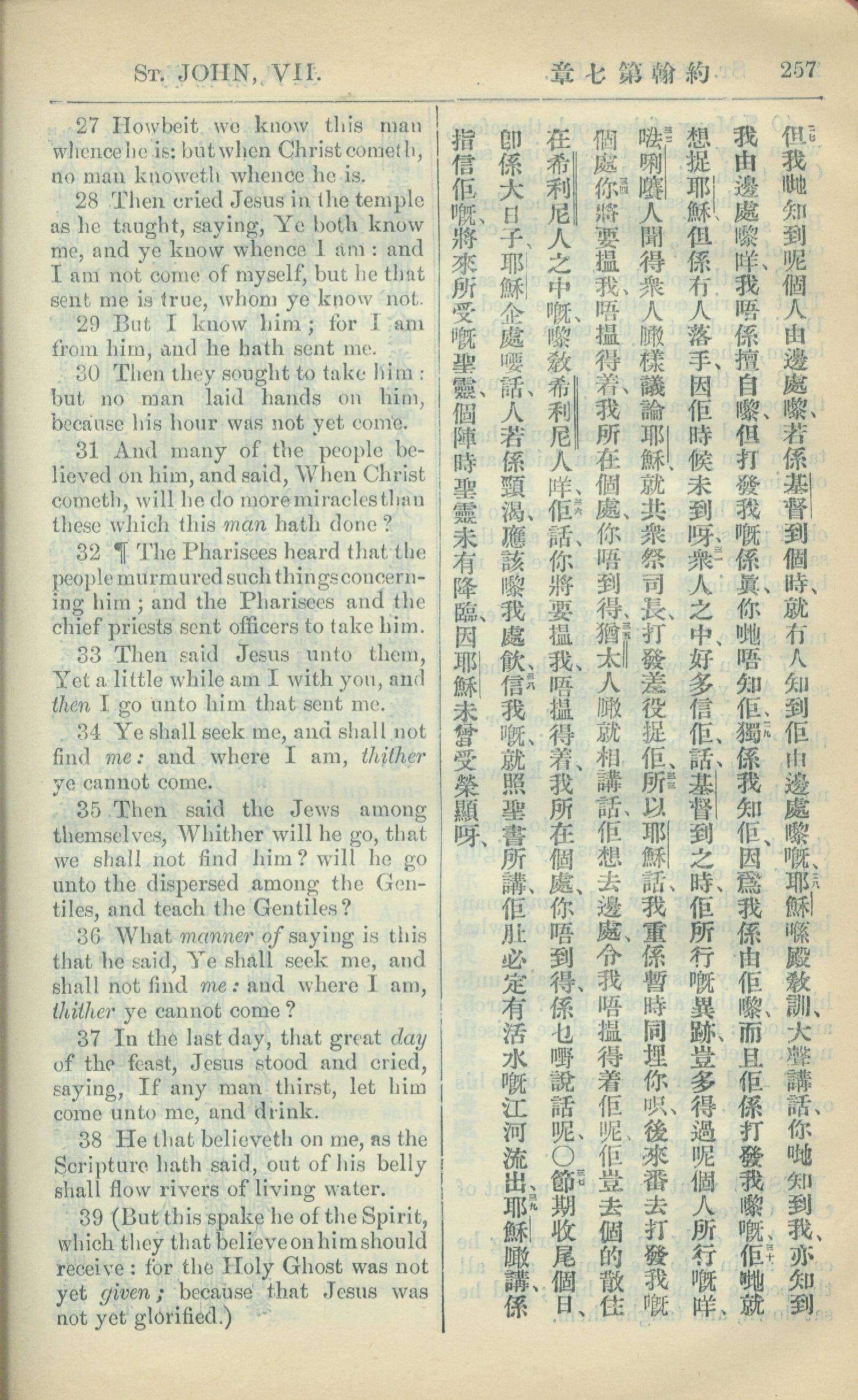 1909年中西字新约全书 约翰福音 7 章 27 节到 7 章 39 节