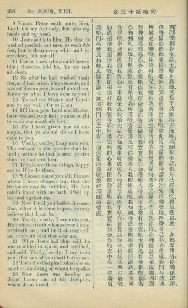 1909年中西字新约全书 约翰福音 13 章 9 节到 13 章 23 节