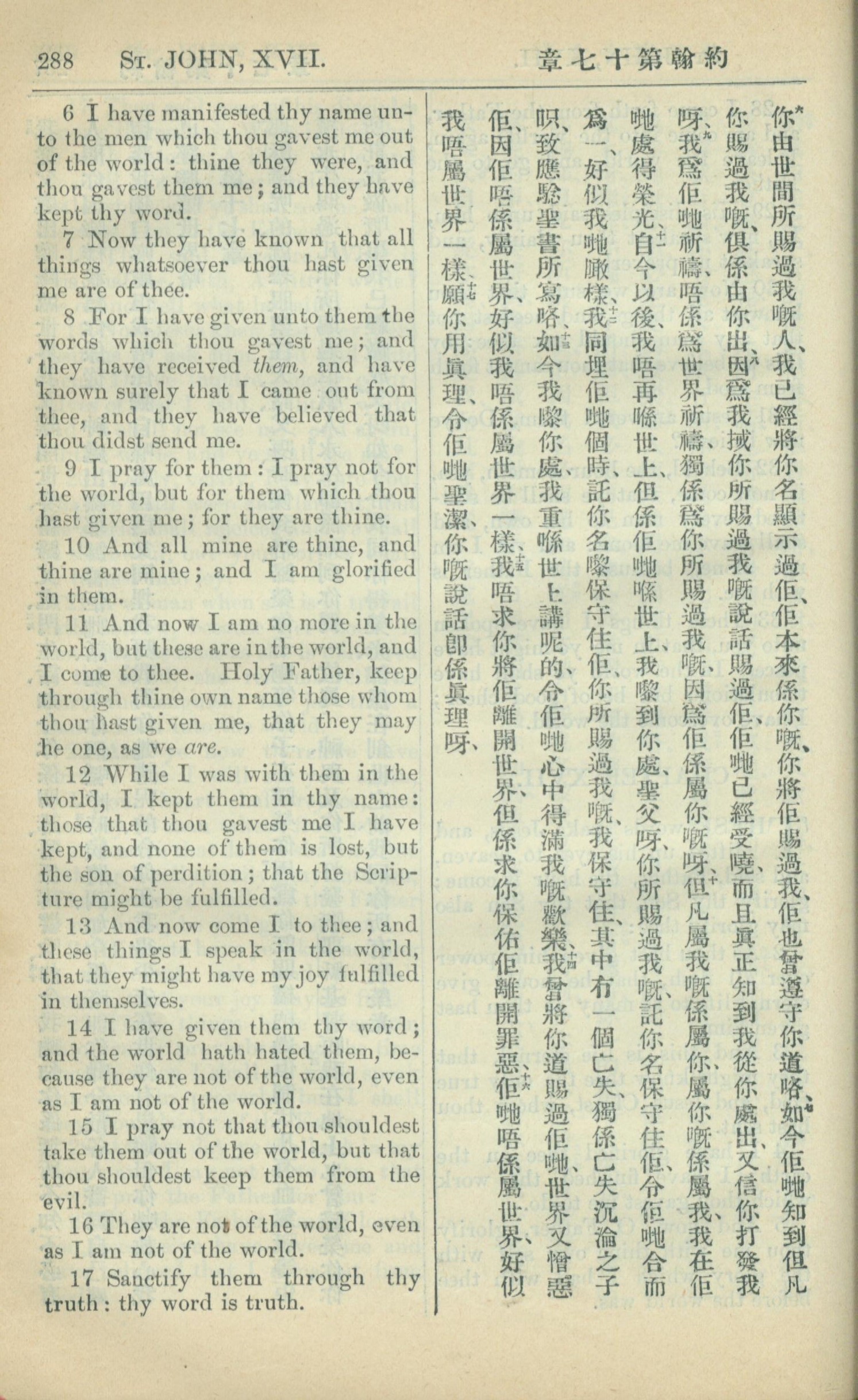 1909年中西字新约全书 约翰福音 17 章 6 节到 17 章 17 节