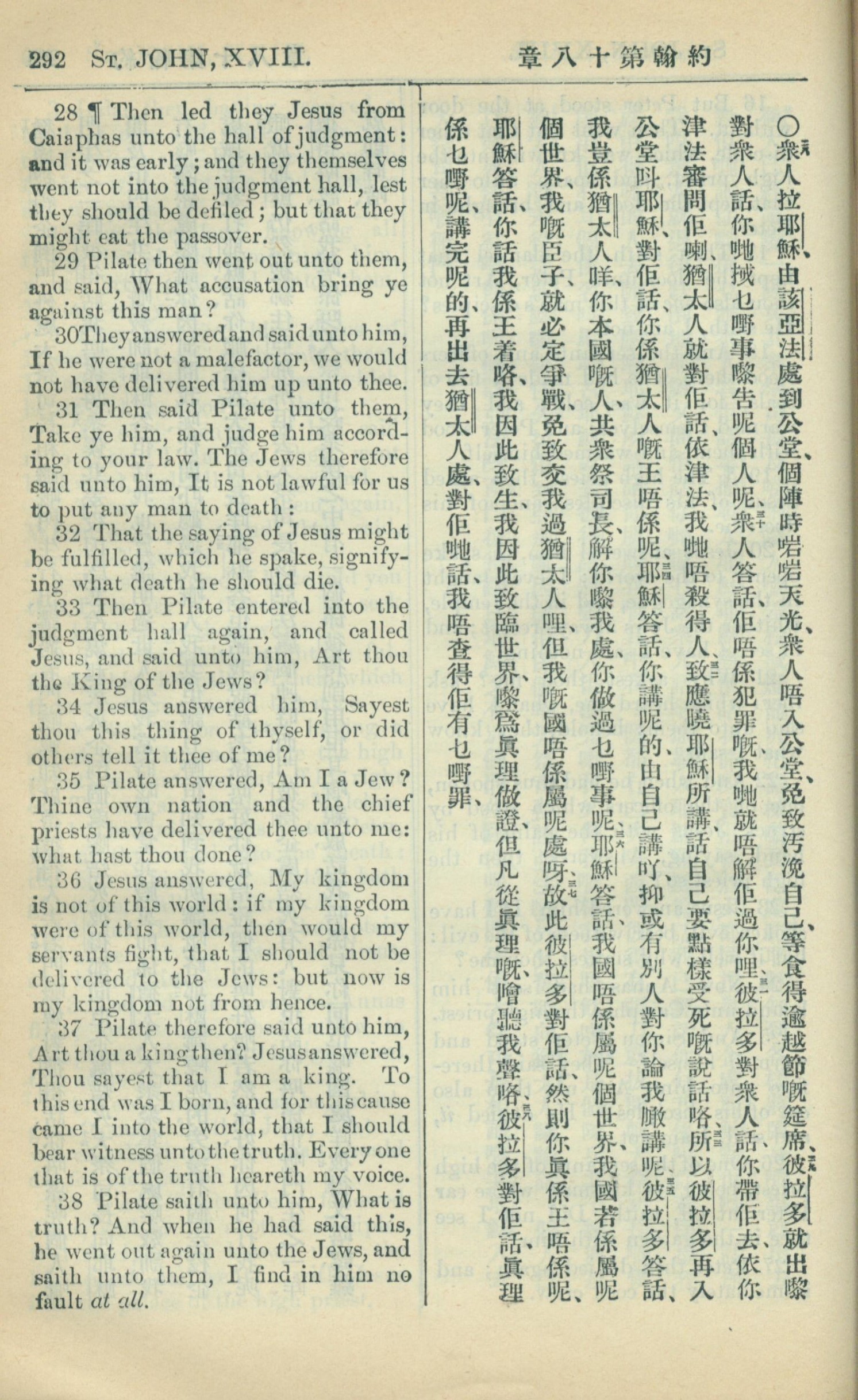 1909年中西字新约全书 约翰福音 18 章 28 节到 18 章 38 节