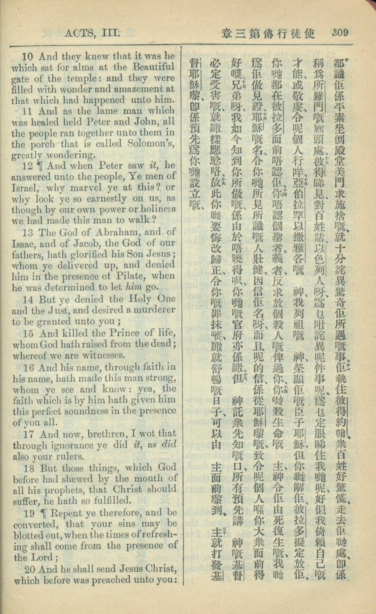 1909年中西字新约全书 使徒行传 3 章 10 节到 3 章 20 节