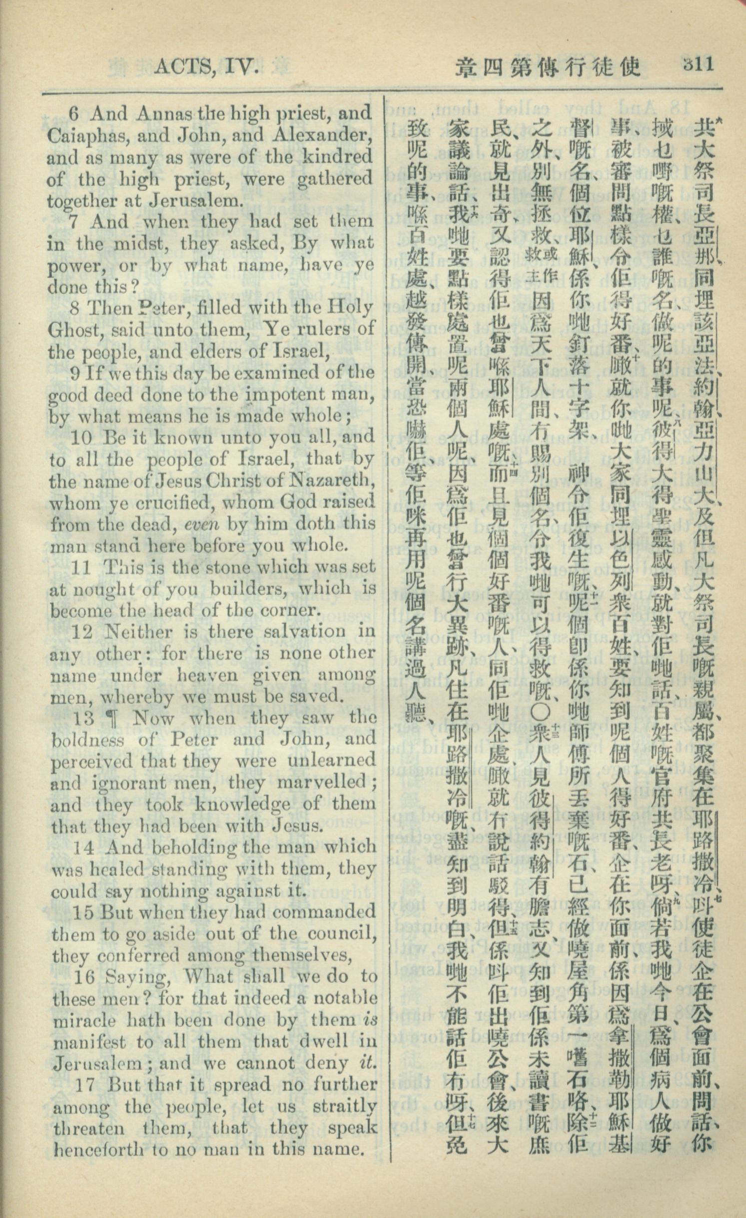 1909年中西字新约全书 使徒行传 4 章 6 节到 4 章 17 节