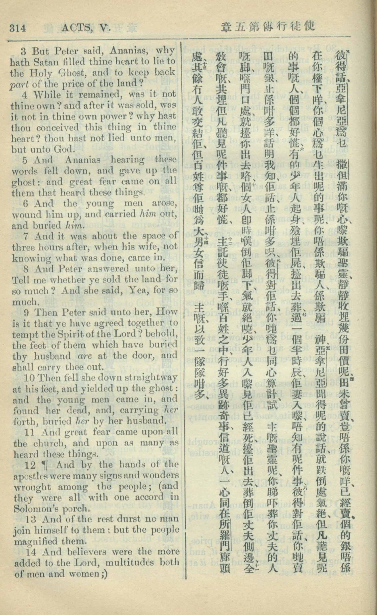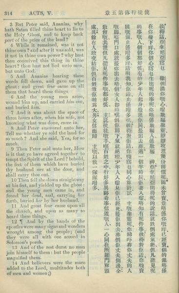 1909年中西字新约全书 使徒行传 5 章 3 节到 5 章 14 节