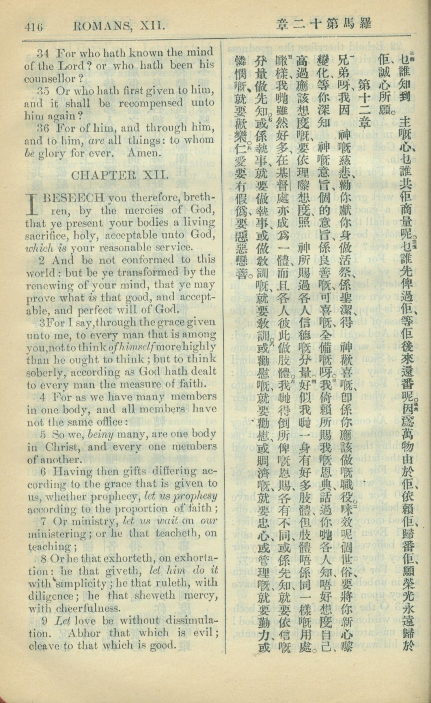 1909年中西字新约全书 罗马书 11 章 34 节到 12 章 9 节