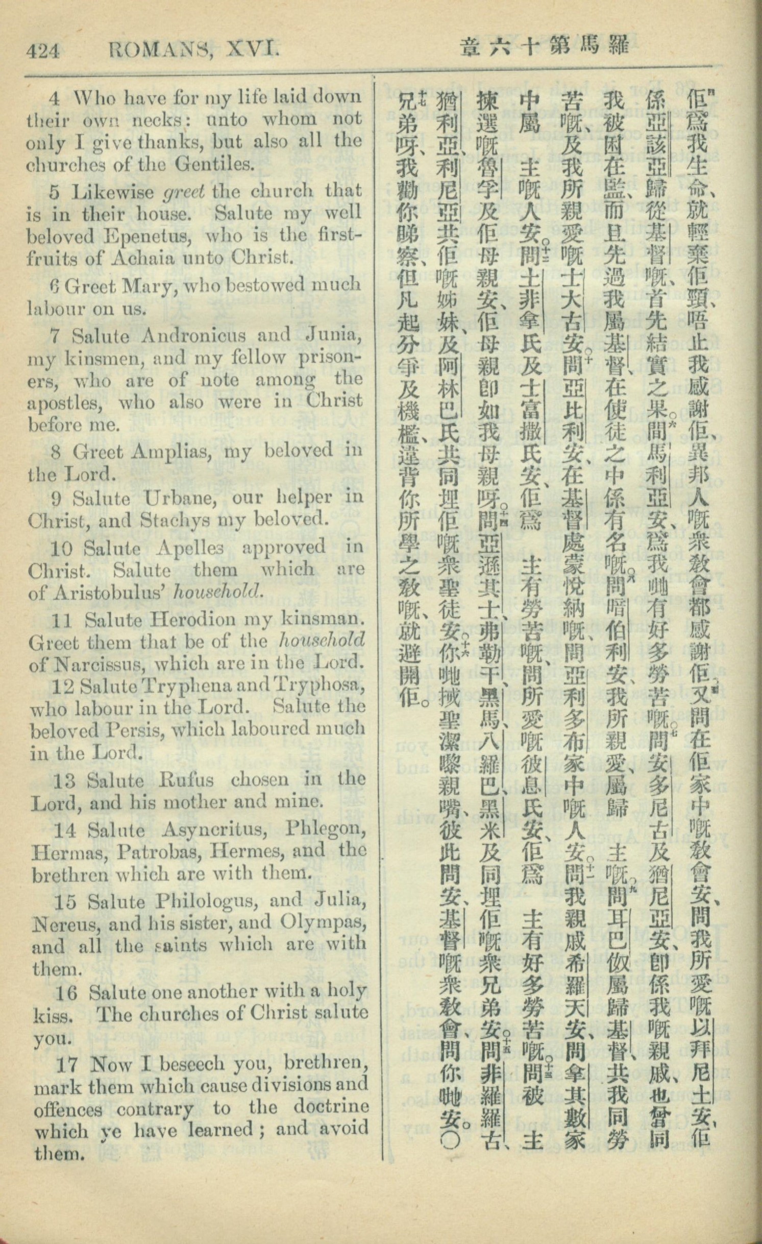 1909年中西字新约全书 罗马书 16 章 4 节到 16 章 17 节