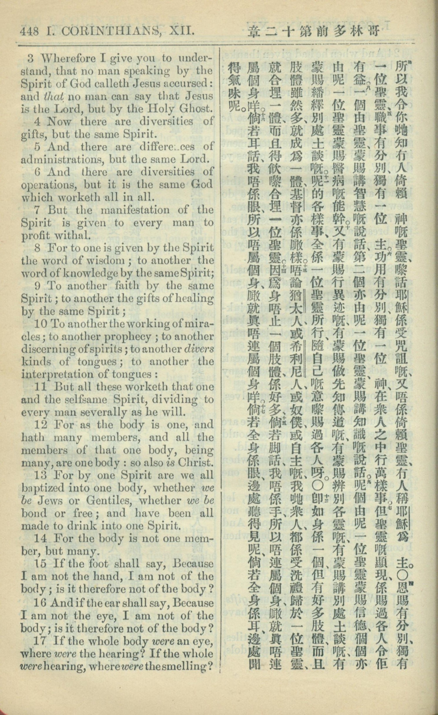 1909年中西字新约全书 哥林多前书 12 章 3 节到 12 章 17 节