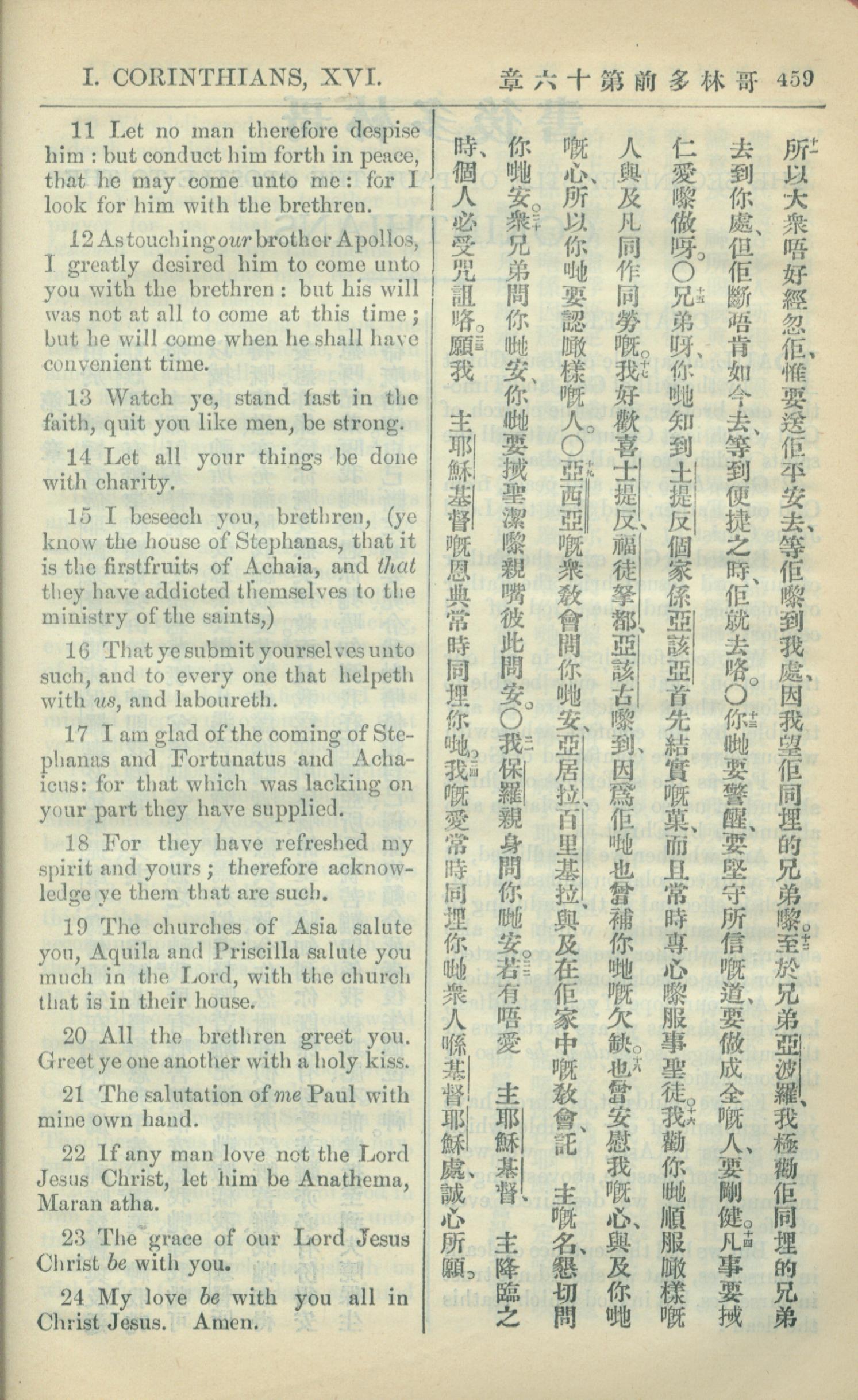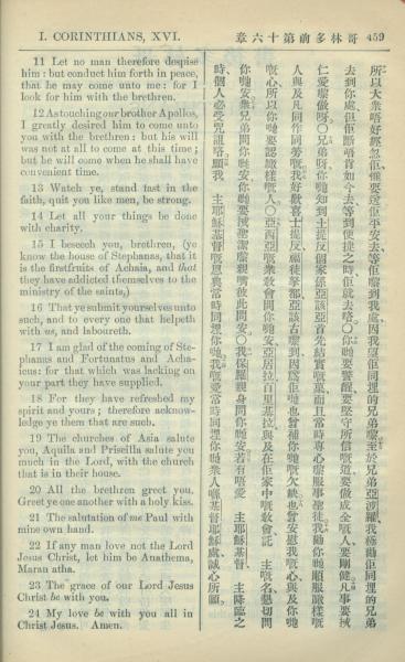 1909年中西字新约全书 哥林多前书 16 章 11 节到 16 章 24 节